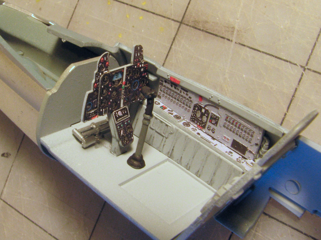 Parts fit over all is good. I only encountered trouble in a couple of places. First, the two halves of the vertical stabilizer are, accurately enough, very thin. However, the plastic molding inside of the edge is a bit too thick, and needs to be sanded down considerably to enable a tight closure along the leading edge. Also, there is no attachment lip inside the fuselage bottom where the one-piece lower wing/fuselage section joins the back half of the fuselage. There’s a small gap there that needed to be shimmed and filled. I should have noticed that and planned ahead by adding an inside lip from a strip of sheet plastic, but I missed it and that left a slight step at the gap that was still noticeable when it was filled.