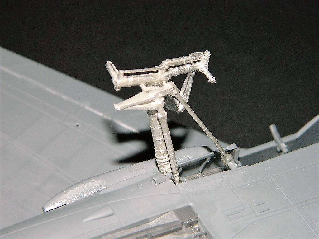 One last thing was to install the forward main gear drag braces; these are very thin, and easy to bend. I also found out that if you clip them with side cuts they can break. I tend to remove the pour runners so I can better access the end sprue mounts for a cleaner cut; what happened was I stretched the metal by this technique, which caused a tensile failure halfway down the strut. I knew this would never hold over time so that is why one of the kit plastic struts is in place.