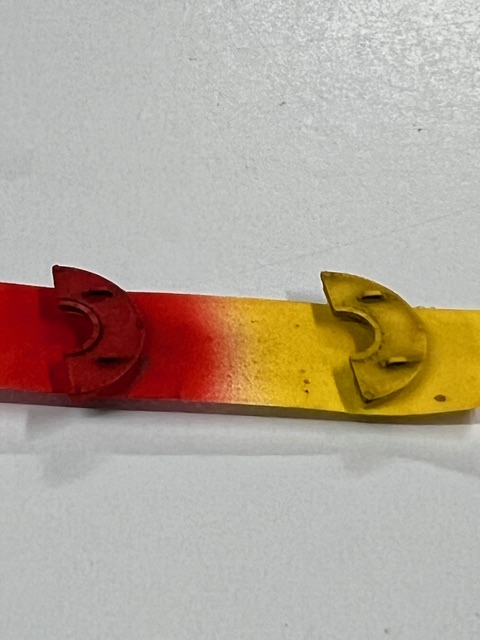 These FOD covers are a straightforward and simple addition to Eduard’s nice Mirage III. They come without instructions, but none are really needed beyond the one picture provided. Nicely cast in pinhole-free gray resin, they just need to be removed from the mold base, washed and painted. Detail is nice and pops out with a dark wash. Based on my references and internet photos I’ve found, these covers were usually painted yellow, although I did find a few in red. I painted one in each color to see how they would look. I used Tamiya white spray-can primer, followed by Vallejo medium yellow and red RLM 23 Model Air paints. After the paint dried, MiG Dark Wash was applied. (The wash is a bit heavy to make the detail more visible in the photos.) I dry-fitted the two FOD covers in place on my Mirage III CJ in Israeli markings to show how they look in place.