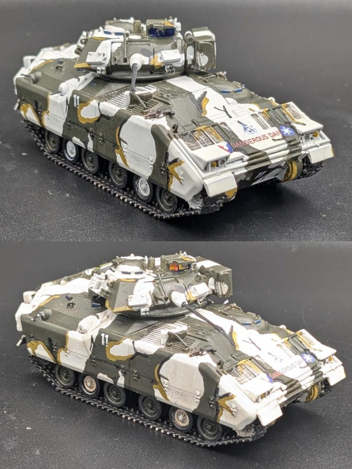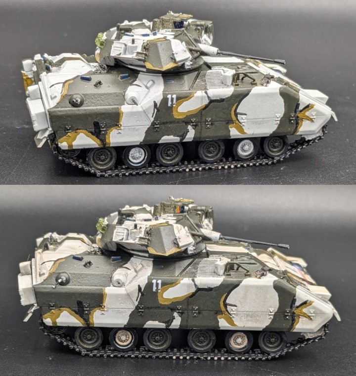 I also used the Missing Link on a couple of models to give a before and after comparison. The 1/72 M2 Bradley in the winter MERDC scheme does a good job showcasing the dirt, earth, and blue gray colors. In the photos of the models, the before image is on top and the weathered model is on the bottom. I also used a 1/35 Panhard 178 that was weathered differently, with the left-hand side weathered and the right-hand side non-weathered. The contrast is subtle and allows the modeler to build up the effects, providing depth.