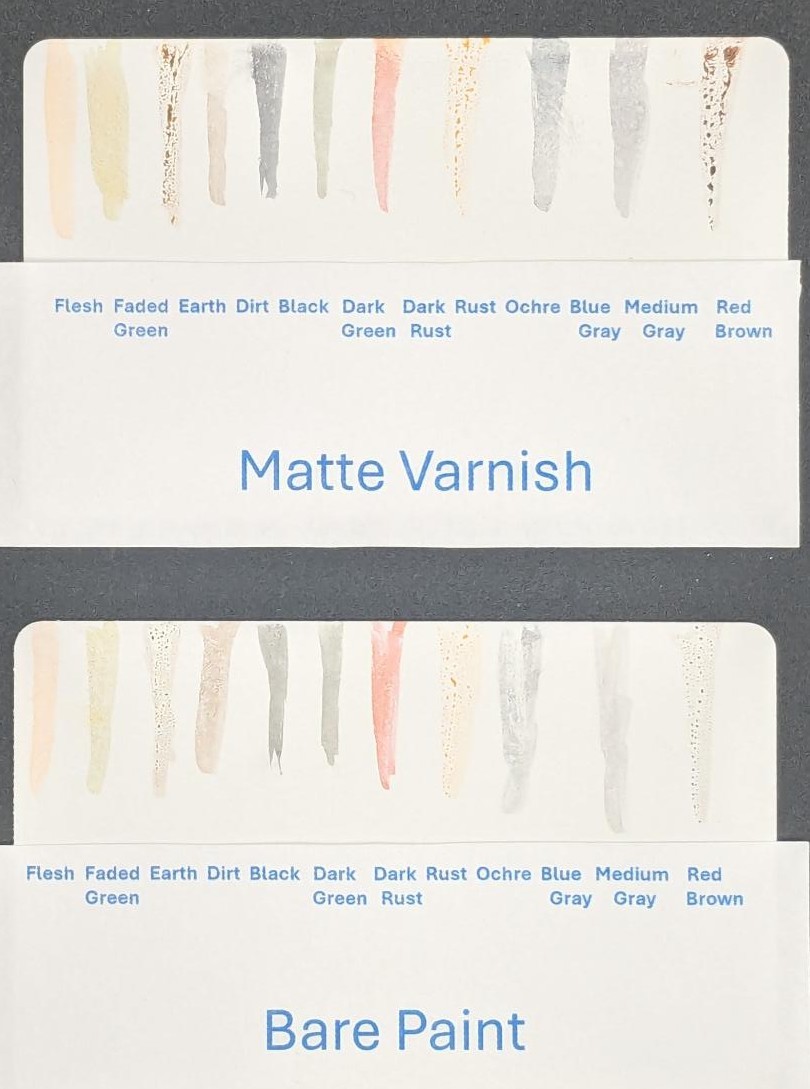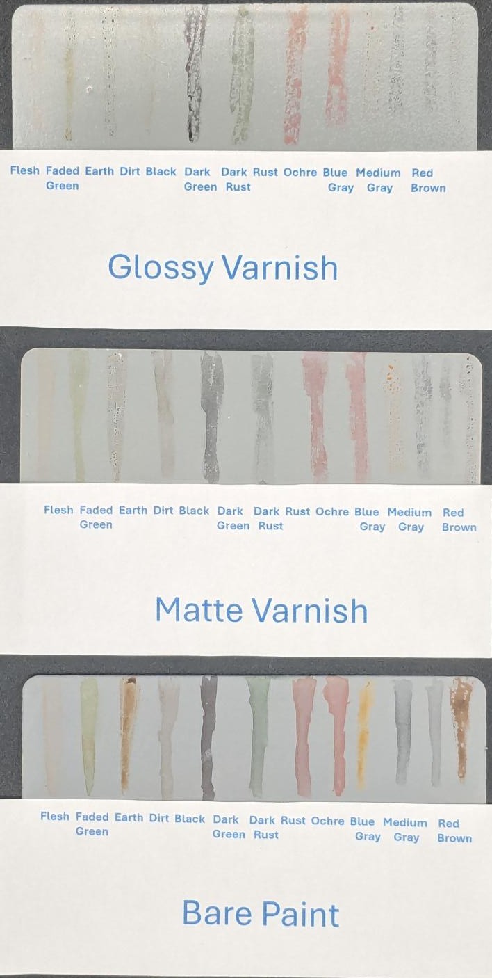 For this review, I used a piece of styrene painted olive green and applied the Missing Link brushes over three finishes: matte, glossy and on bare paint itself. After applying the Missing Link colors, I realized the olive green washed out the watercolors (pun intended). The attached photos show the expected results; some colors pop, some are barely visible, depending on the color. I then painted three styrene cards in primer gray with the same three finishes (matte, glossy, and on the paint itself). Other colors are more visible and give an example of the density that can be applied. Finally, I painted two styrene cards in white with a matte finish and bare paint, not bothering with glossy as the watercolors did not lay down. It is no wonder that AMMO by Mig recommends a matte or satin finish.