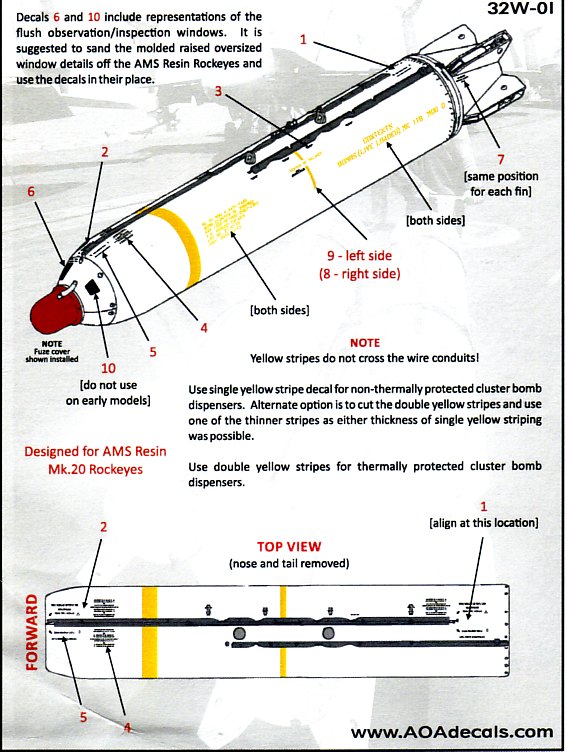 One thing that has been overlooked by some manufacturers is markings for the weapons they include in their kits. They are sometimes afterthoughts or incomplete and a few are actually not bad, but seeing a beautifully built plane with average weapons kills the mood. AOA Decals has started a trend to fix that with their release 32009 for Mk. 20 Rockeye cluster combs.