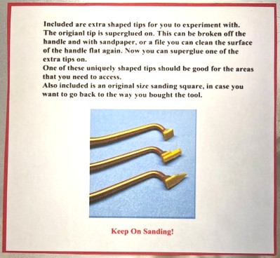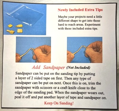 This handheld tool is designed to get into tight spaces like wing roots, intakes, or other tight or hard-to-reach spaces. It has four resin-like tips which are to be superglued to the tip of the tool, and sandpaper is to be attached to the tip with double-sided tape, or by using a self-adhesive sandpaper. I must admit that at first this seemed like a pain to set up, but it is very quick and easy. I tested the tip change out by removing the attached tip and prying it off with a hobby knife, and it came off cleanly and in one piece. I then glued on another tip, the one with the triangular point. I attached a small piece of sandpaper with double-sided tape and then trimmed the sandpaper to match the tip with my hobby knife, and the sander was ready to use.