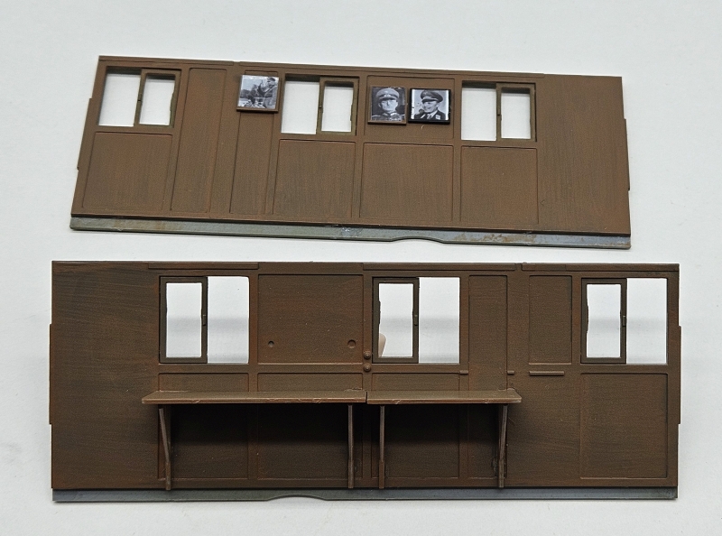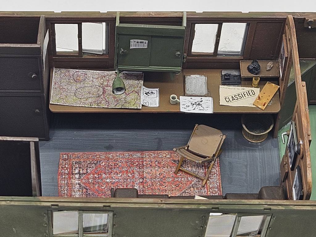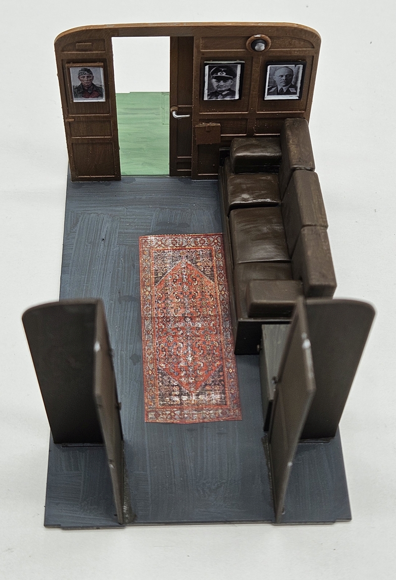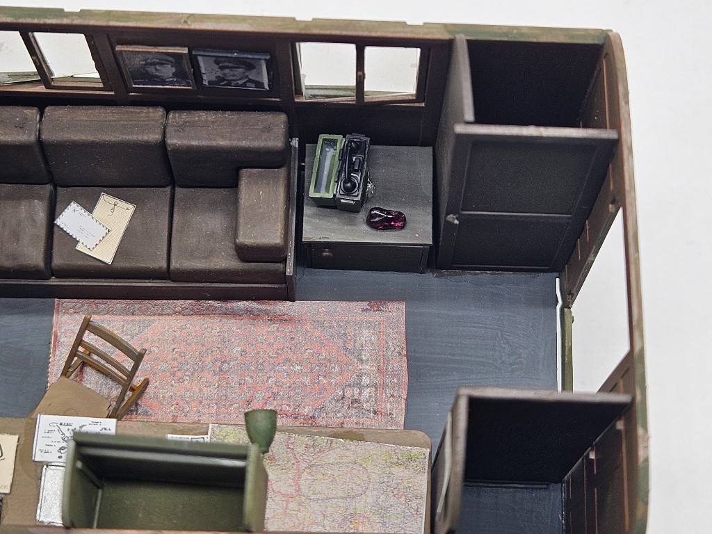 Step 91 starts the interior detail: adding lights, photo frames (Monty had framed photos of enemy generals around him to inspire and motivate him, and these are included as decals to add to the frames), and a leather couch made up of 17 pieces. A sidestand and cabinet faces are up next, along with the toilet, bringing us up to step 116. Windows and their frames and more photo frames and the desk are added to the walls, which are then added to the main floor. The instruction manual has a floor for the bathroom and a rug for the main floor you can cut out and glue down. Desk accessories are up next. Two desk lamps, a cabinet, ink well, and other assorted bits are added to the desk. A pocket door for the latrine and a back door are then added.