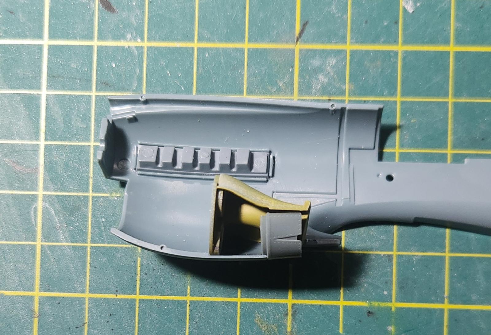 Another important step to pay attention to is Step H, which deals with part F33. This part forms the opening of the air intake above the propeller. It is a very small part, and the danger is that when gluing it into place, it is very easy for it to fall through the hole and be forever lost inside the model – and the model becomes a baby rattle. I solved it by using some Revell cement. I applied the cement along the edge of the opening and allowed it to get tacky. I then applied part F33, but it was not in its final position. I allowed it to sit for a few seconds to tack up, and then I began to slowly slide it inward until I had it in position. It worked!