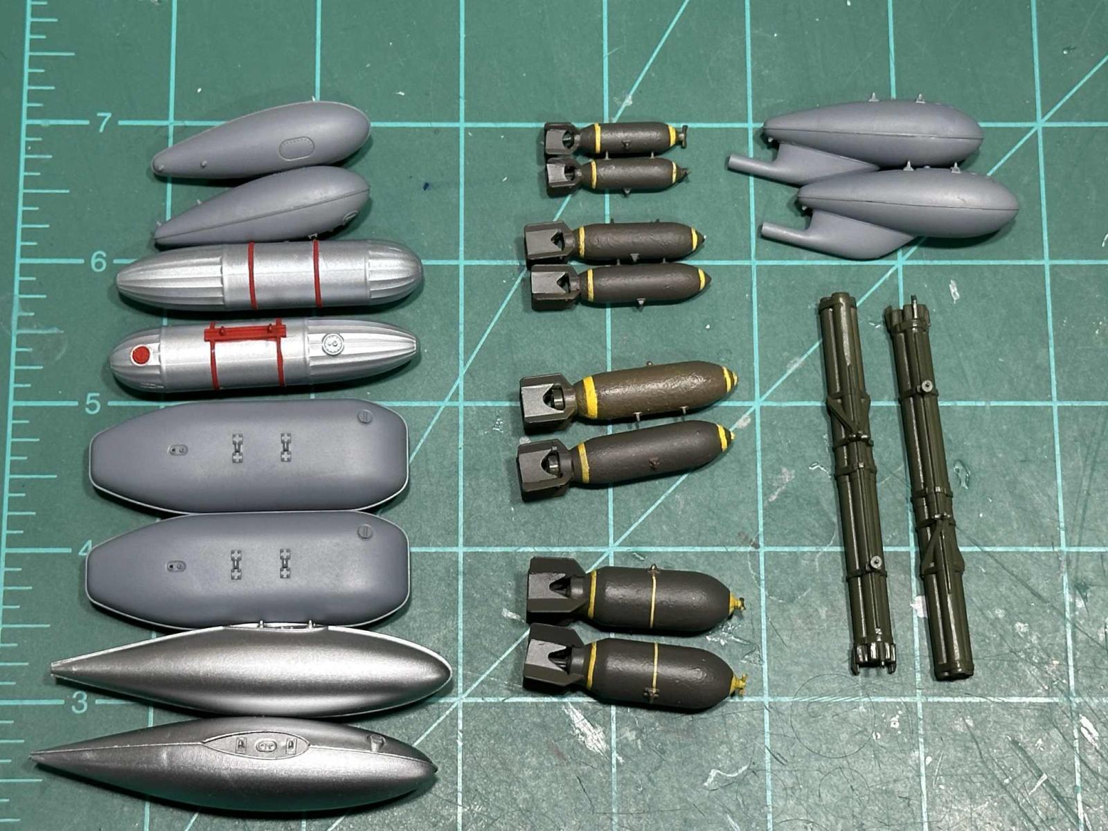 The kit comes with two types of 1,000 lb., one type of 500 lb., and 250 lb. bombs. It also has 75-gallon, 108-gallon paper, 150 gallon and 200 gallon drop tanks. In addition, the kit comes with smoke generator pods and M-10 bazooka launchers. They all fit together perfectly as long as you remember to drill out the mounting holes slightly. On my bombs I used Mr. Surfacer 500 dabbed on with an old brush and stippled a rough surface. Then I painted the bombs Tamiya Flat Yellow and masked off the nose and rear stripes. They were then painted in a splotchy pattern of Tamiya Khaki Drab and MRP OD 41. The drop tanks were either AK Extreme Aluminum or MRP Neutral Grey. The bazooka was painted British Dark Green. Like the model, the decals fit perfectly.