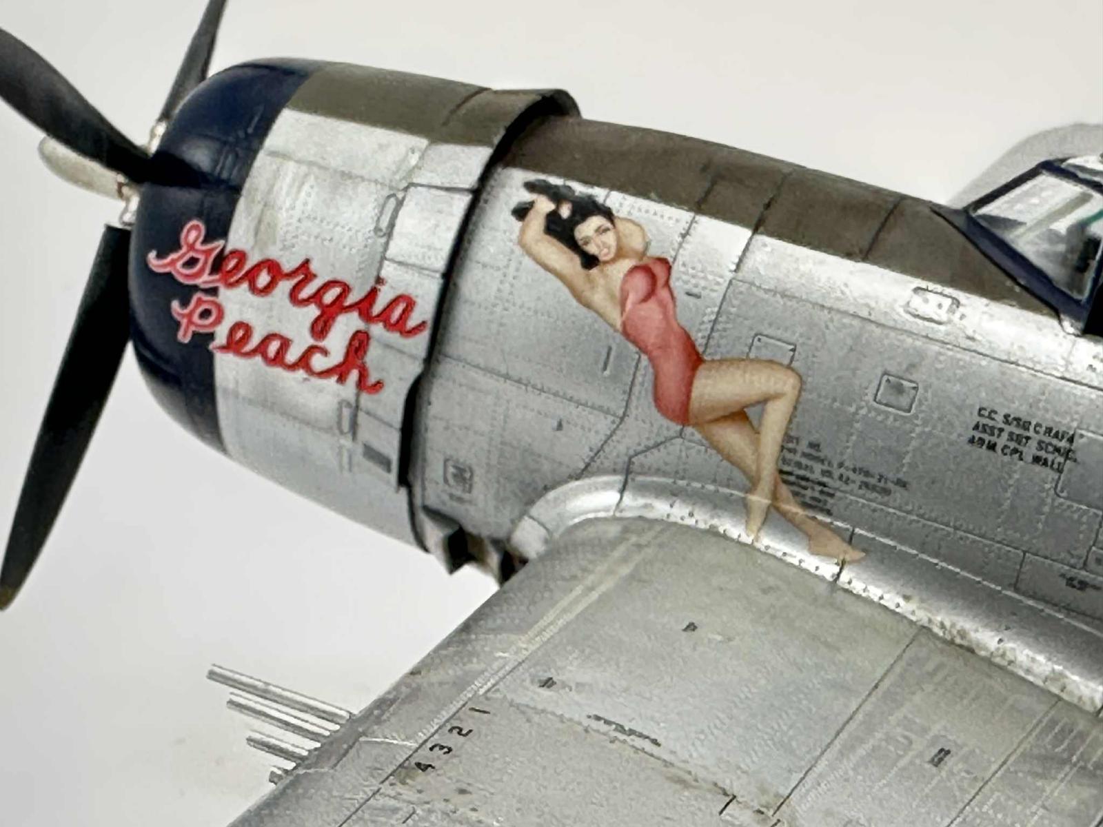 I tried to add the Georgia Peach nose markings and realized that I had painted the nose band too big as the first two letters have a white background that aligned with the band. I quickly removed the decal and kept it moist while I did an emergency paint job on the nose. I finally got the proper position and added the nose markings, which aligned perfectly. I breathed a sigh of relief, and the rest of the decals were added. Everything fit perfectly and settled down perfectly. What I should have done was to measure the length of the decal from the end of the word to the white letters and then masked accordingly. Luckily, I was able to pull it off, but just barely.