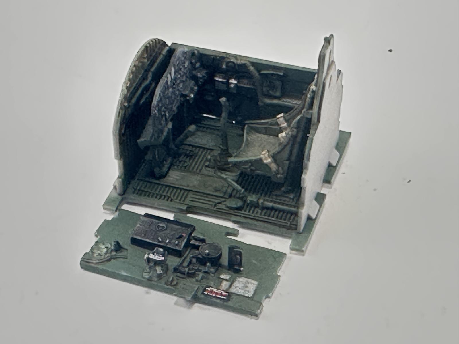 I painted my interior with MRP Dull Dark Green and details in black. Particular attention must be paid to the seat supports (Part Cd16). You may want to leave the seat out until much later. I broke mine at least twice.