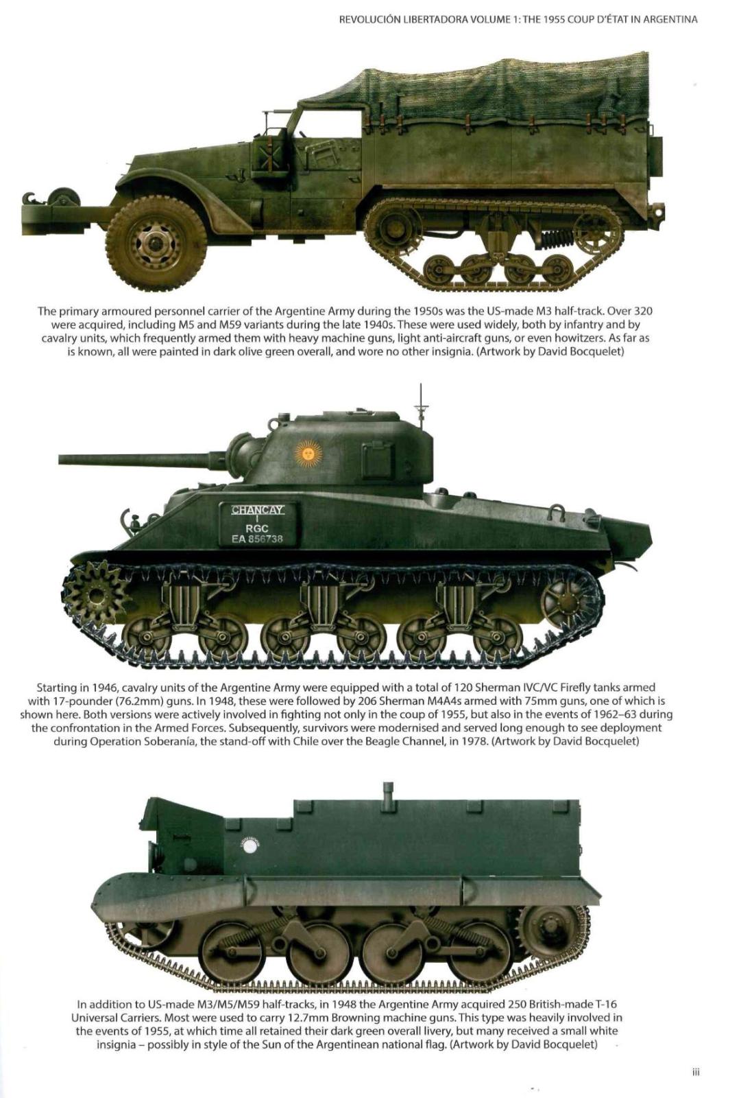 Modelers and historians will enjoy this book with color illustrations of AT-6 Texan, AT-11 Kansan, C-47, C-54 Skymaster, PBY-5 Catalina, Gloster Meteor, Fábrica Militar de Aviones (FMA) IAe.33 Pulqui II (based on the Focke Wulf Ta.183), FMA IAe.24 Calqin (indigenous design comparable to the Mosquito), Fiat G.55A Centauro, Fiat G.46-2 trainer, Avro Lancaster, Avro Lincoln, and for armored vehicles, the M3 halftrack, M4A4 Sherman, and T-16 Universal Carriers. Black and white photographs show these vehicles, aircraft, ships, weapons, maneuvers, key figures, and the aftermath of the Plaza de Mayo attack. Also of interest is page 44 in Chapter 9 (Forces of the Coup) with information and photos of notable World War II German Luftwaffe personalities: Walter Baumbach, Hans-Ulrich Rudel, Adolf Galland, Otto Behrens, and Kurt Tank
