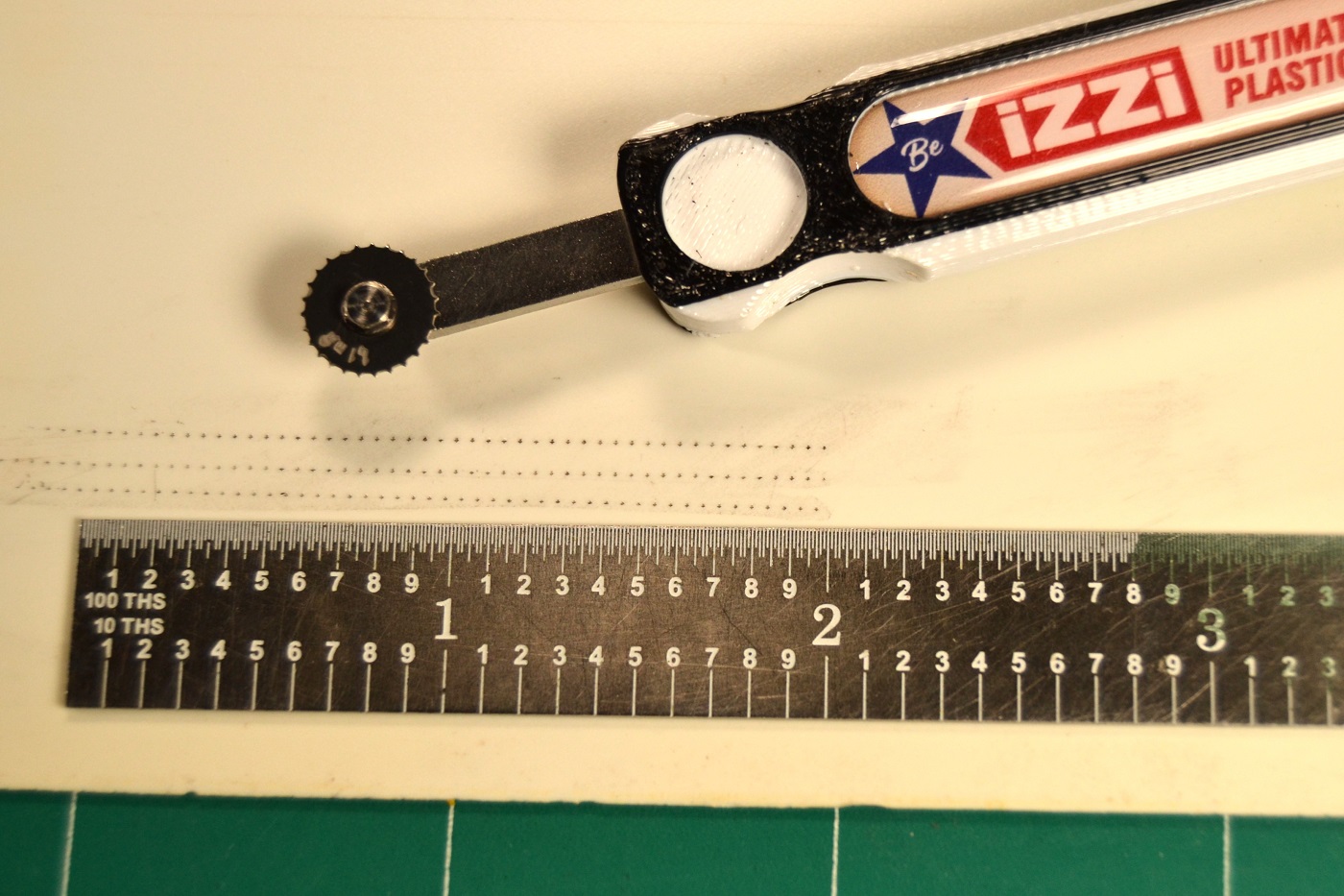 This is a single row rivet pounce wheel with a rivet pitch (distance between rivets) of 1.10 mm. Its main target use is for larger models of 1/32nd or 1/35th scale. The handle is made from a 3-D printer and the filament is colored white and black. An olive-green dot is colored into the handle and correlates to the size on the sheet packaging for 1.10 mm rivet pitch.