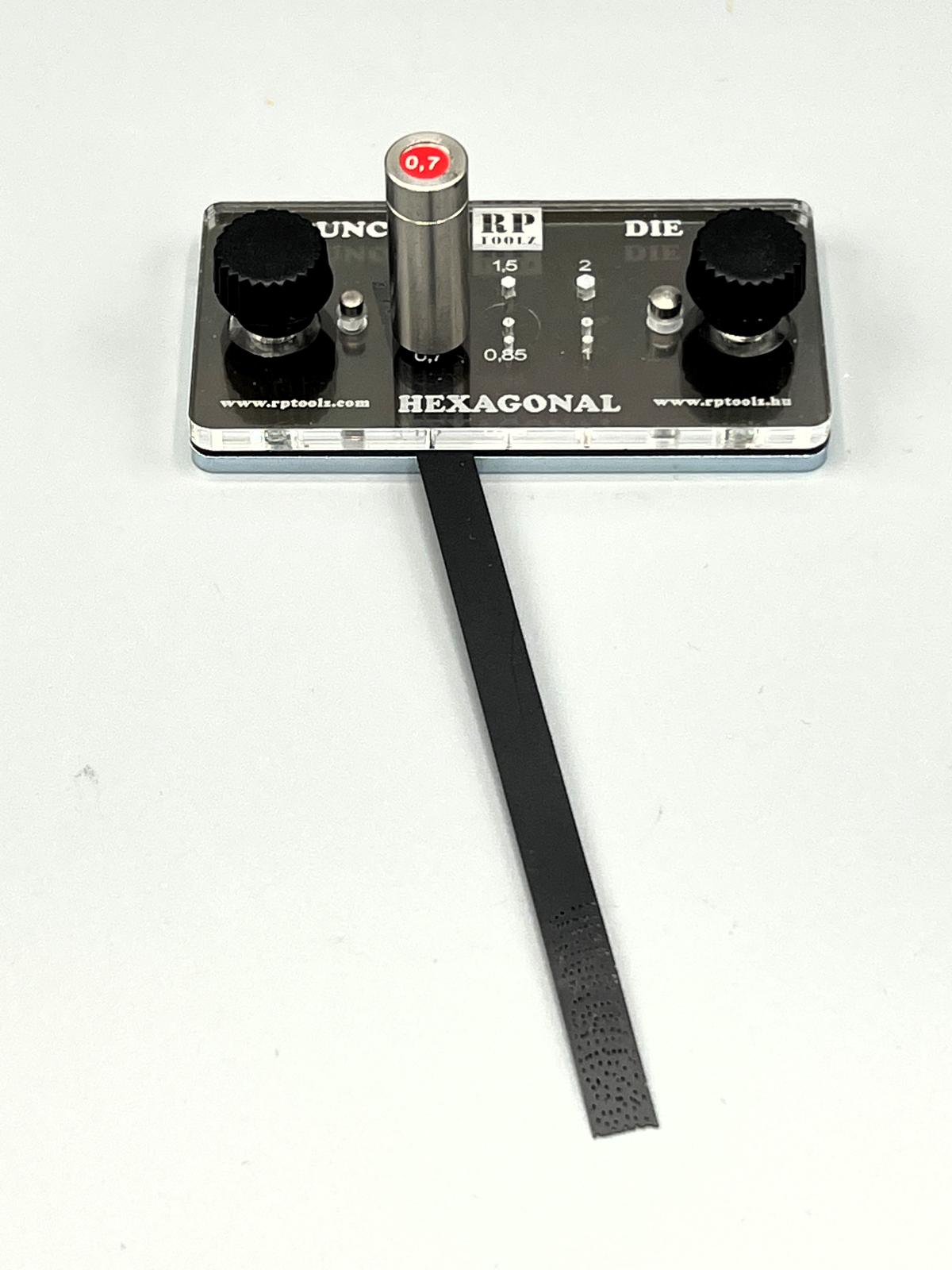 This is a high-quality tool from RP Toolz in Hungary. It is made in the European Union from steel, aluminum and Plexiglas. It includes a die that allows you to clamp the Styrene strip, six punches, and a small hammer. It allows you to make bolt heads at 0.7mm, 0.85mm, 1mm, 1.25mm, 1.5mm and 2mm. The hammer feels a bit light to me and might not be up to punching hexes from thicker material.