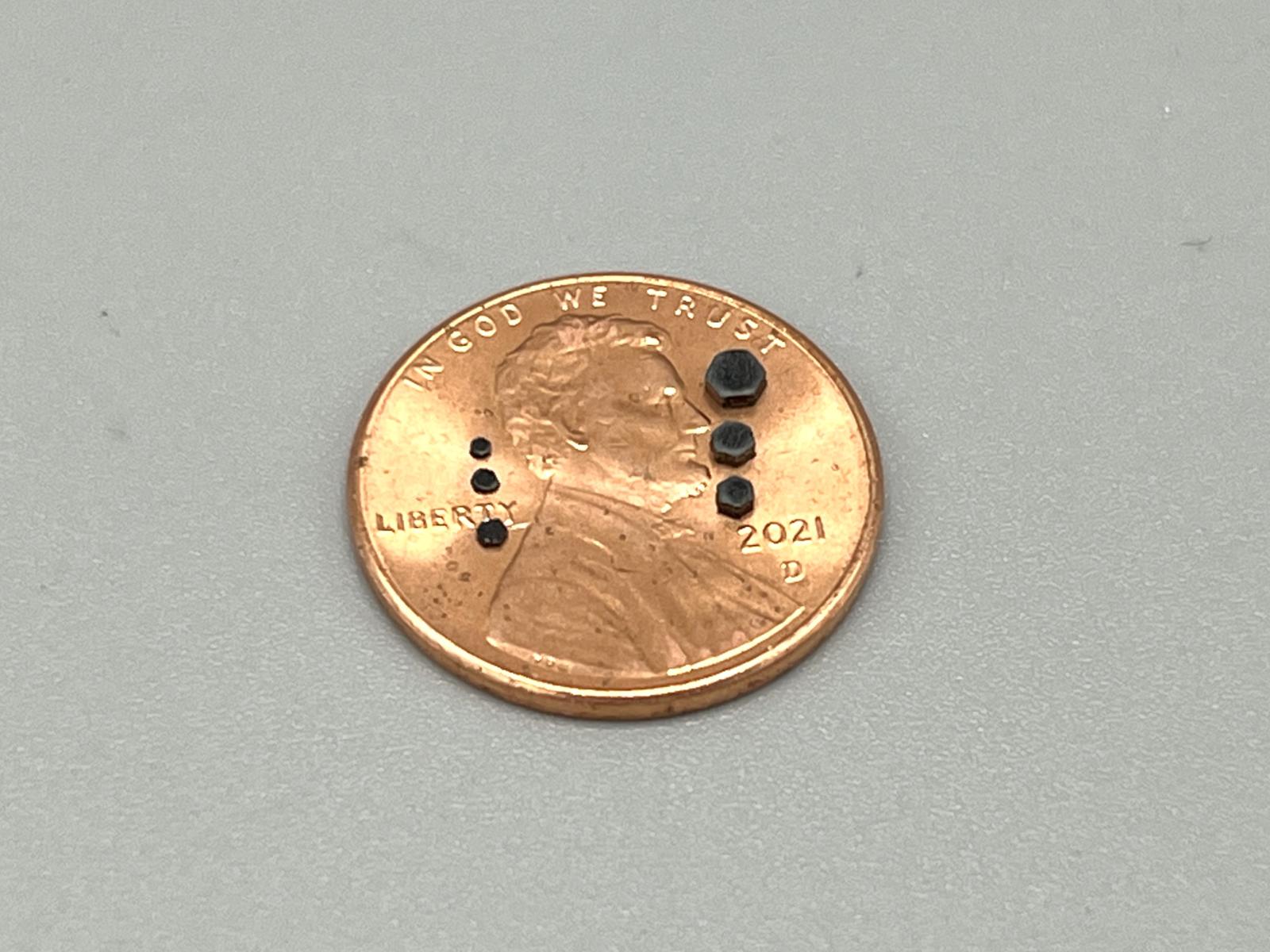 To use the tool, slide a strip of Styrene under the appropriately sized hex opening in the die, lightly tighten the thumbscrews to hold it in place, carefully insert the punch and give it a wack with the hammer. Remove the punch and retrieve a perfectly shaped hex bolthead. To make it easier to align the punch and die for the three smaller sizes, the punch has a round rod for alignment. The silver, round rod goes into the hole in the center of the die. This provides proper alignment and prevents damage to the tool. This alignment pin also punches out a round piece in addition to the hex bolt. With my old eyes, I had to wear my Opti visor to separate the round and hex pieces.
