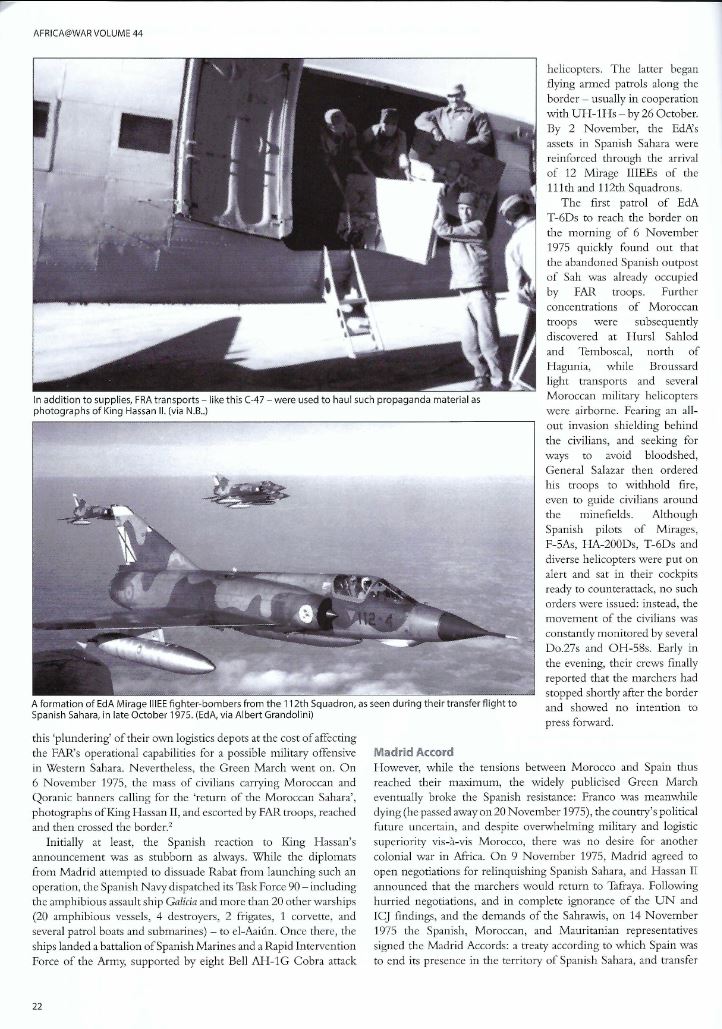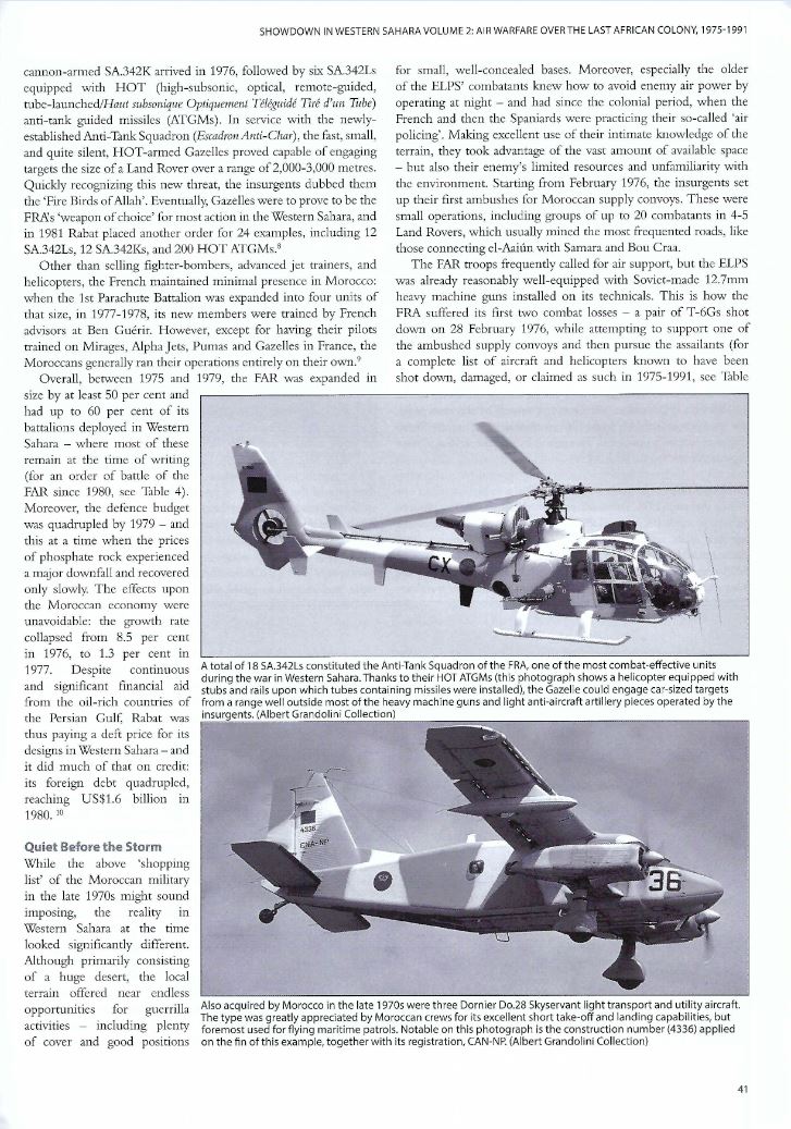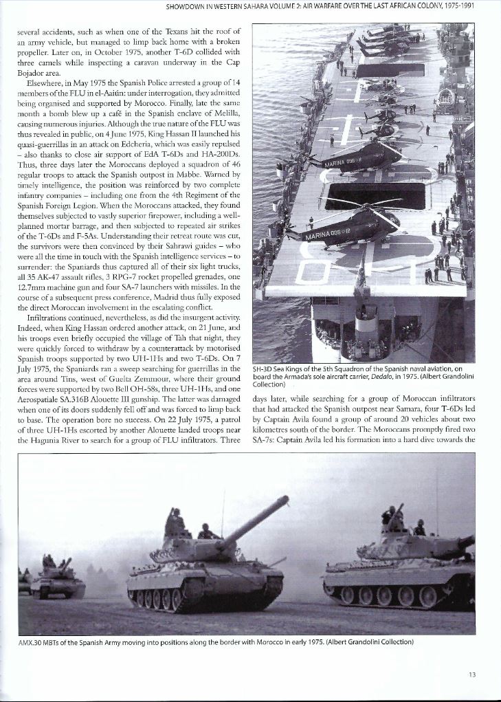 Western Sahara is one of the most sparsely populated countries in the world with an estimated population of around 500,000. Nearly 40% of that population is in the northern coastal city Laayoune. The authors open up with the history of the area going back 2,000 years where Berber nomads inhabited the area of the West African coast of Morocco south to Mauritania. A Spanish “protectorate” from the 15th century to 1975; Spain, under UN pressure (and the end of Franco’s regime) gave control of the area to a joint administration of Morocco and Mauritania. The authors note that while this book is focused primarily on the air war in Western Sahara, it must be in the context of the complex political forces from Western Sahara’s neighbors, Morocco, Mauritania, Algeria, France, Spain, and the “indigenous” POLISARIO insurgency. Volume 1 focused on post-World War II through 1975 when the Spanish left their former colony. This volume looks at 1975 through 1991, when a cease-fire between Morocco and the POLISARIO was implemented. The cease-fire really had no large effect, as the war continues between the two parties. This is unlikely to change any time soon since Morocco to this day still considers the Western Sahara as part of Morocco. The UN has recognized SADR (Sahrawi Arab Democratic Republic) to be the legitimate government of Western Sahara, a concept that is not supported by Morocco that controls most of the land, natural resources, and all the major cities. The sections include: