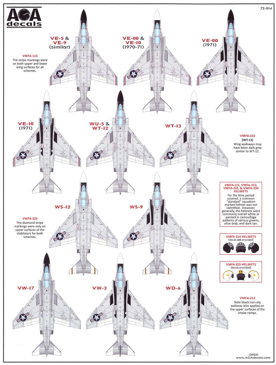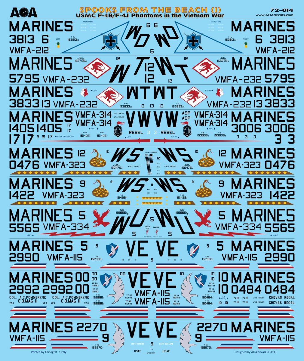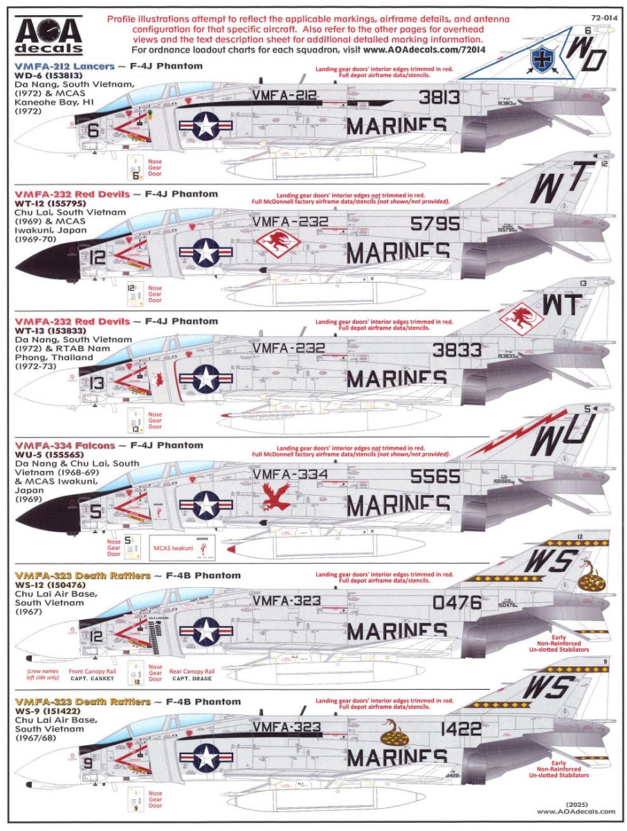 This 1/72 decal sheet covers six USMC F-4 Phantom squadrons during the Vietnam War: