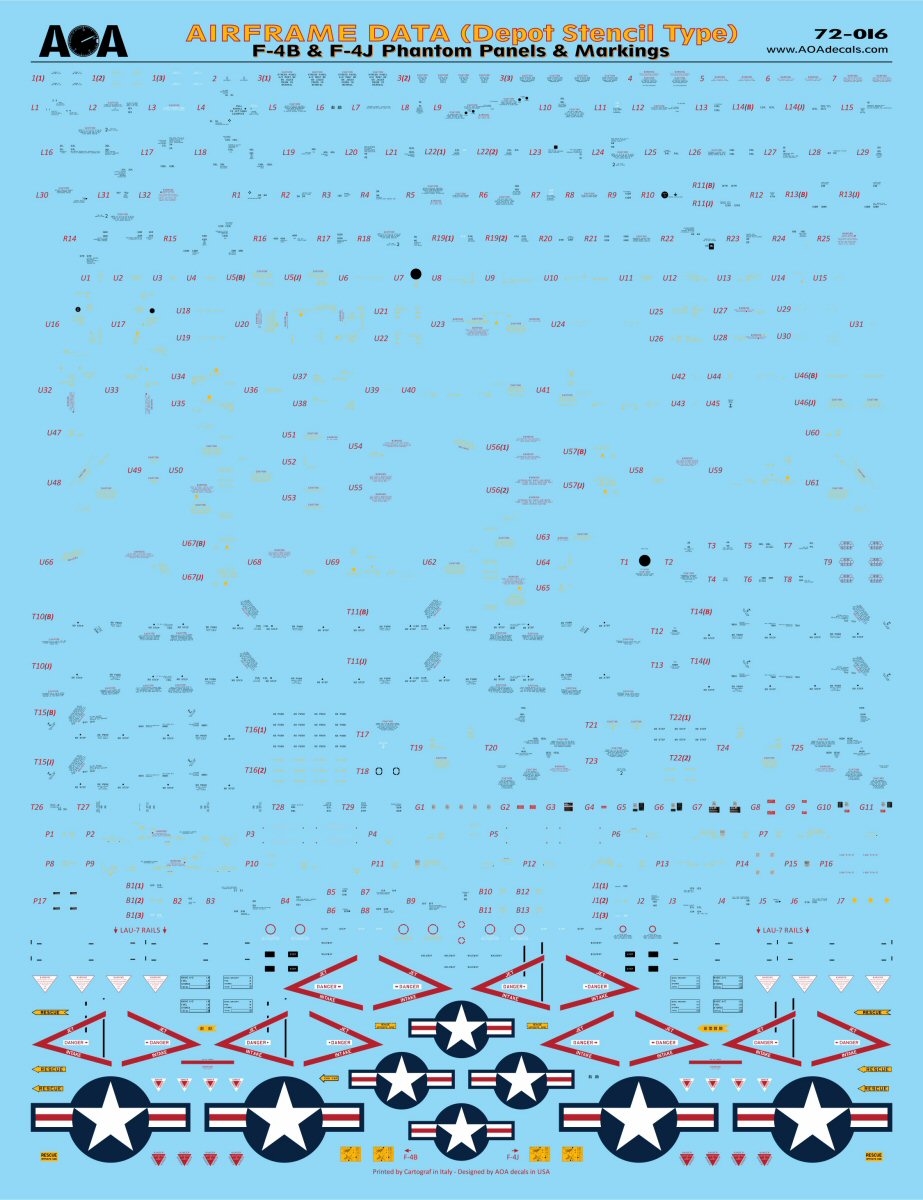 There are three decal sheets provided. Nineteen versions of over twelve aircraft of the USMC Vietnam War F-4B/F-4J Phantoms are in this set! The main sheet provides tail markings, bureau numbers, and squadron markings for specific Phantoms. The second & third sheet, 72-016 ($11.50 if purchased separately), has common data/stencil/walkway decals and compliments the first sheet. With all three sheets, you can build one complete F-4B or F-4J Phantom.