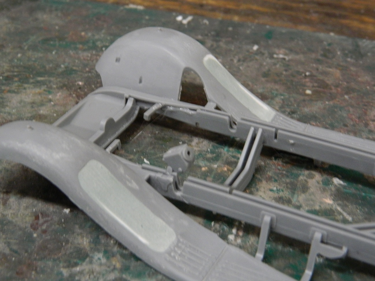 When I first received the G$ kit I knew I had to do something different with it – I was going to make a surf rod out of it. Searching through my spare parts I found some Center Line wheels along with some wide tires. The first modification was to cut out the spare tire wells on the front fenders and then fill them in with styrene and Bondo. While the putty was setting up I frenched the taillights.