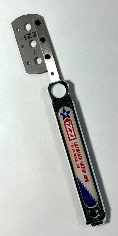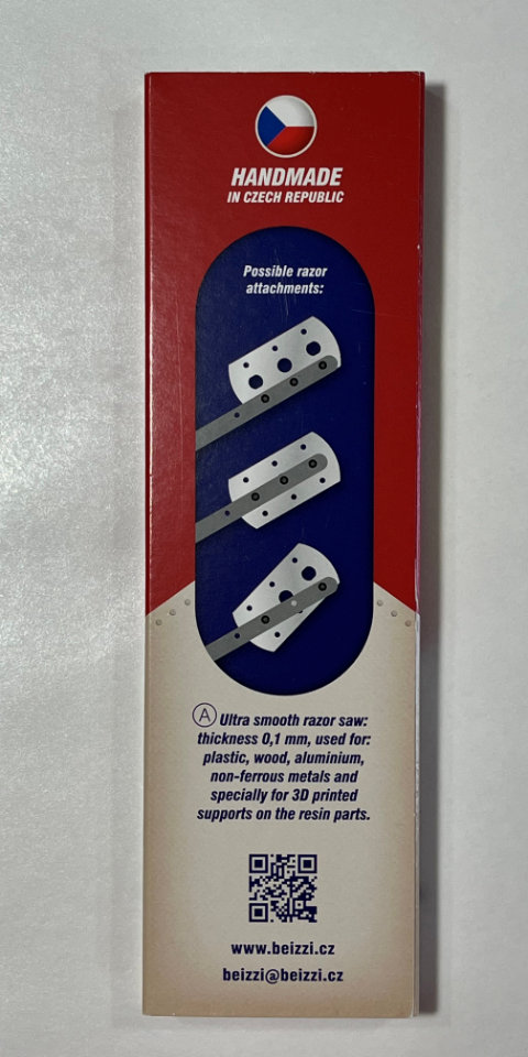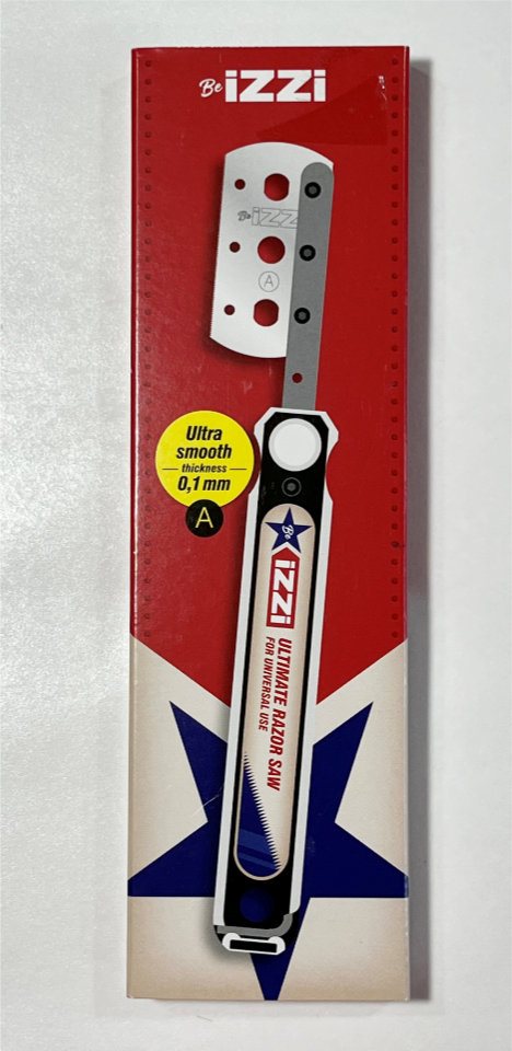 Be Izzi is a relatively new company from the Czech Republic specializing in hobby tools. This item, the Ultimate Razor Saw, is comprised of a standard handle with a straight attachment fixture and their Ultra Smooth, 0.1mm thick razor saw blade.