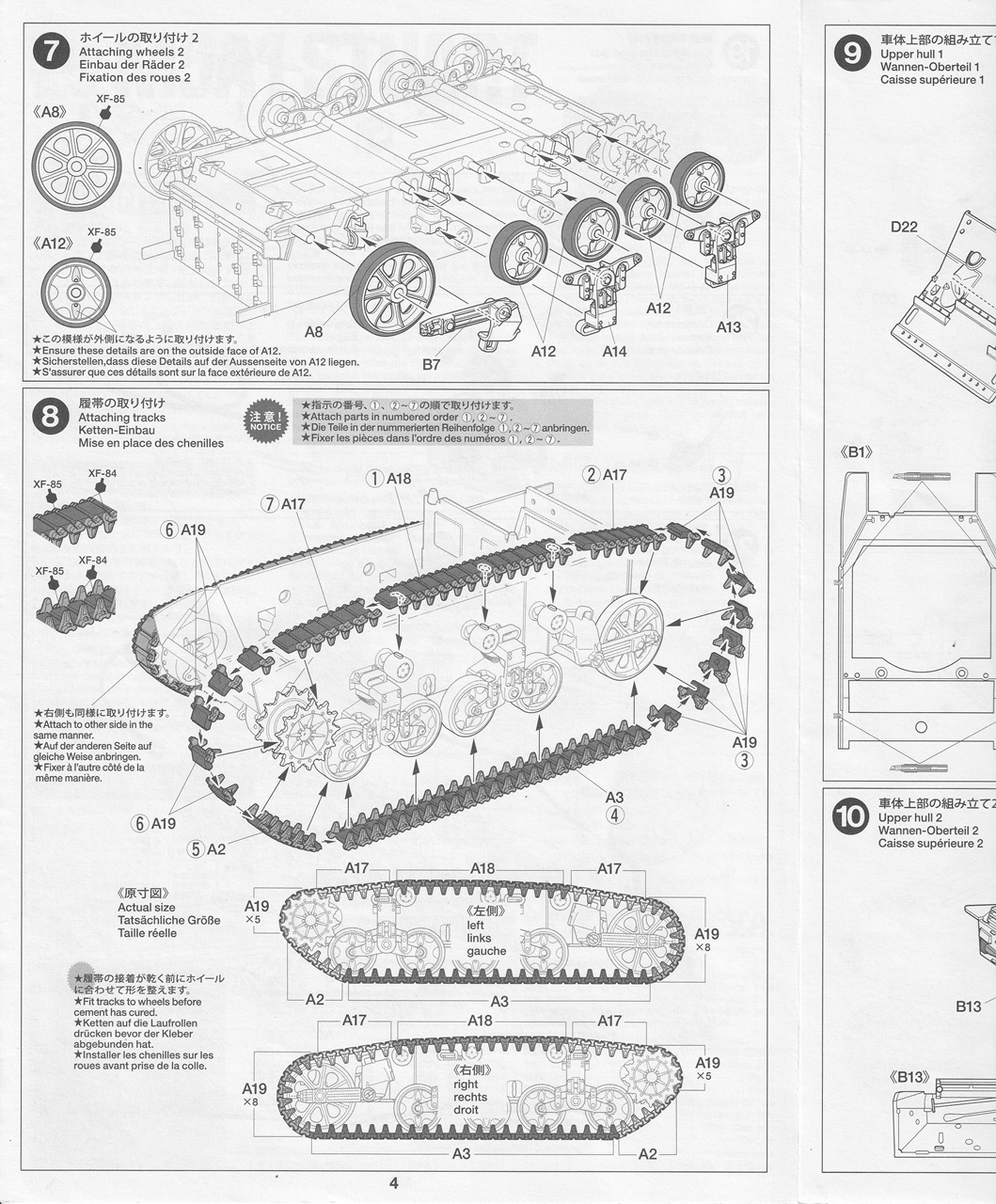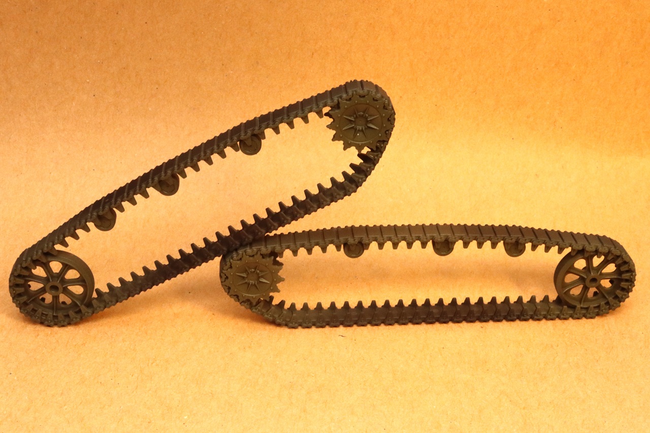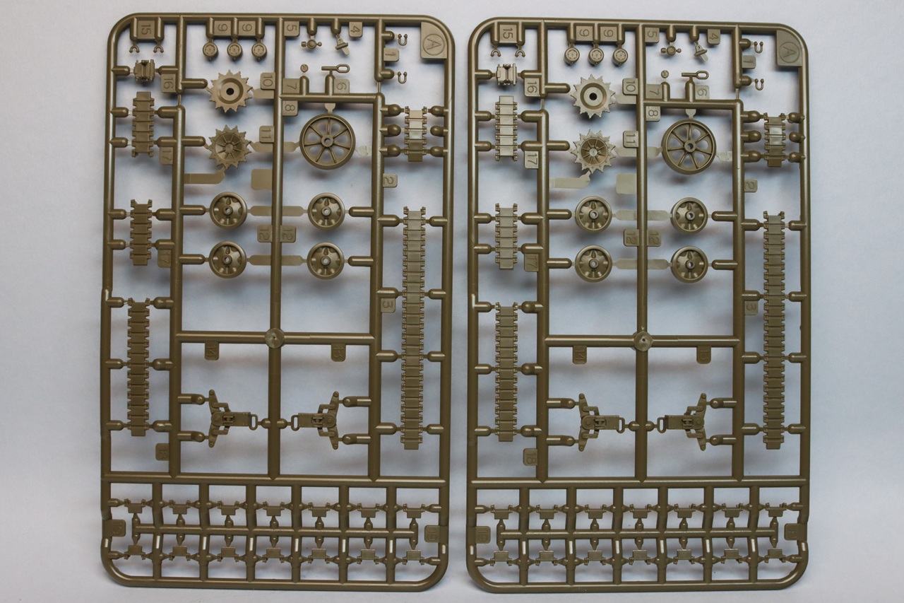 The tracks are of the link-and-length type. There are some shallow ejector pin marks on the inner surface of the track. The individual track links (A19) are tiny and easy to lose, fortunately two extras are provided. The tracks are meant to be built up around the assembled suspension. To make painting and weathering of the lower hull and suspension easier, I temporarily attached the wheels with white glue. This allowed me to assemble the tracks and then remove each run as a single piece. (soaking in water overnight loosened the white glue). The return skids molded in the tops of the bogie sides (A13 and A14) are not molded to scale thickness. Their appearance can be improved by slightly beveling the outer edge so that it appears thinner.