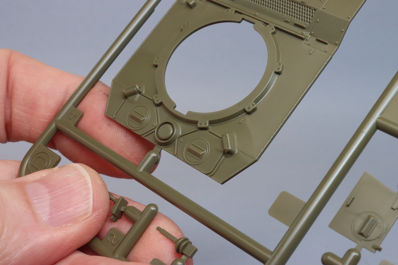 The plastic parts are cleanly molded with no flash and minimal parting lines. The design of this kit seems to emphasize ease of construction. Very nice details are included where it can be done without increasing complexity, but some details are omitted where they would require more parts. I assume that Tamiya wants their 48th scale kits to be simpler and cheaper than their 1/35th scale counterparts. The front and sides of the hull are molded as a single piece. The top and rear of the hull glue to it for a very simple assembly. Very nice weld beads are molded into the hull. The front of the lower hull has a convincing cast-metal texture. The inner half of the suspension bogies are molded into the sides of the lower hull, simplifying construction and making misalignment impossible. There are ejector pin marks on the lower hull sides. After the wheels are installed and some mud slopped around, they won’t be obvious. The pioneer tools on the vertical part of the rear hull are molded in place; on the sloping part they are separate pieces. Except for the commander’s hatch, all the hatches are molded in the closed position. The commander’s hatch can be installed either open or closed. If you install the hatch open, be aware that no part is provided to depict the lower half of the periscope. There are shallow ejector pin marks on the inner surface of the commander’s hatch. The tops of the periscopes are molded in the closed position. The periscope covers on M5s were either flat or humped and sometimes had protective cages on top. The periscope covers in the kit are the humped style with no protective cages. Through the use of slide molding, the 37mm gun has an open muzzle. The turret lift rings are represented by mouse-ear shapes molded to the turret sides. The appearance of the rings can be improved by carefully drilling out the centers. M5 Stuarts have six large screws along the upper edge of the rear end of the hull side. These screws are missing from the kit. I simulated the screws by drilling holes for thin plastic rod and then cutting the rods just above the surface. The light guards are molded a little thick to survive the manufacturing process. Their appearance can be improved by carefully cutting and filing away material while they are still on the parts tree. If you want to replace these parts with photo-etch, Hauler makes an upgrade set for this kit. Check out Andy Taylor’s review of the Hauler parts. I did not use any aftermarket parts in this build.