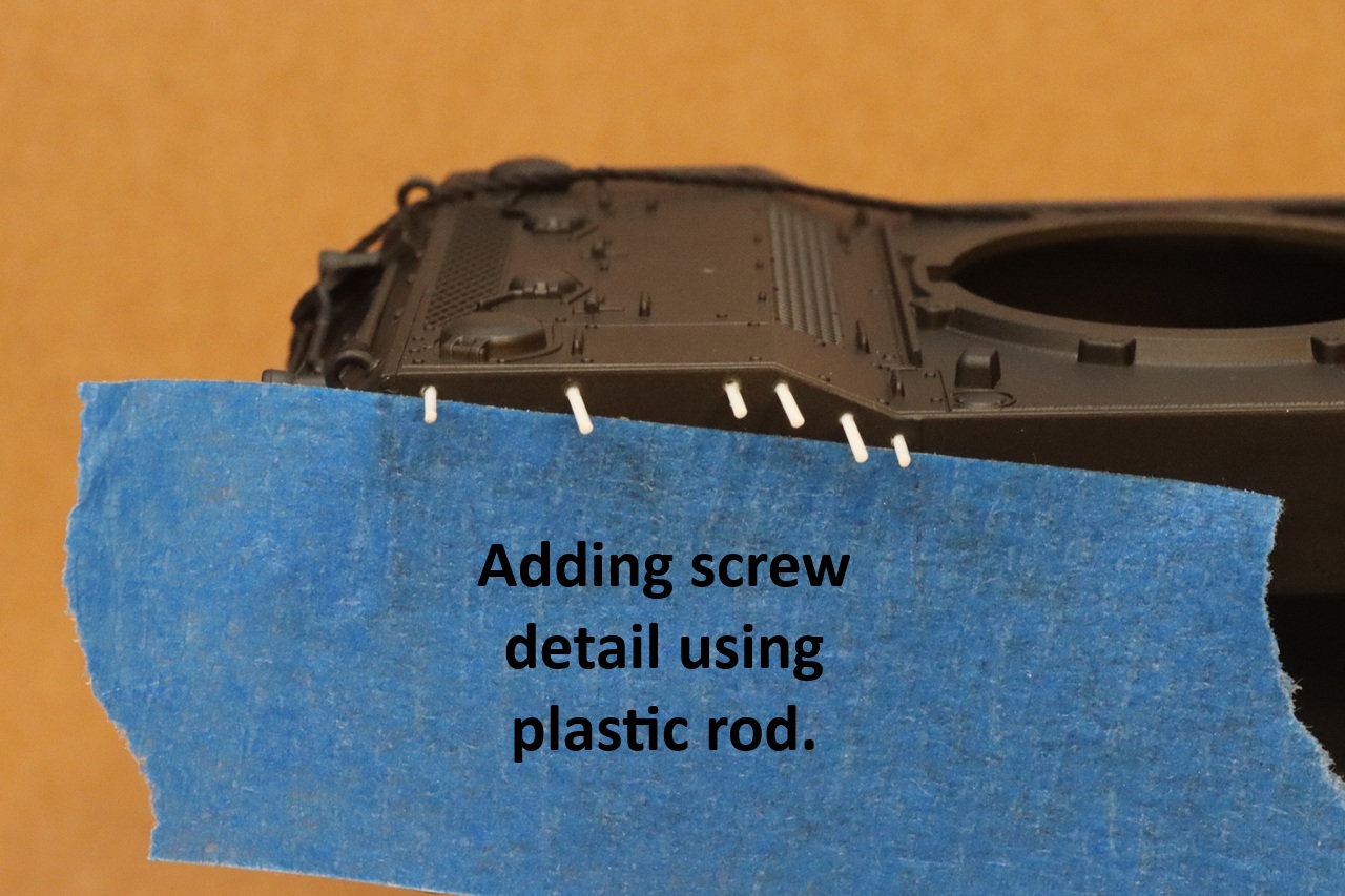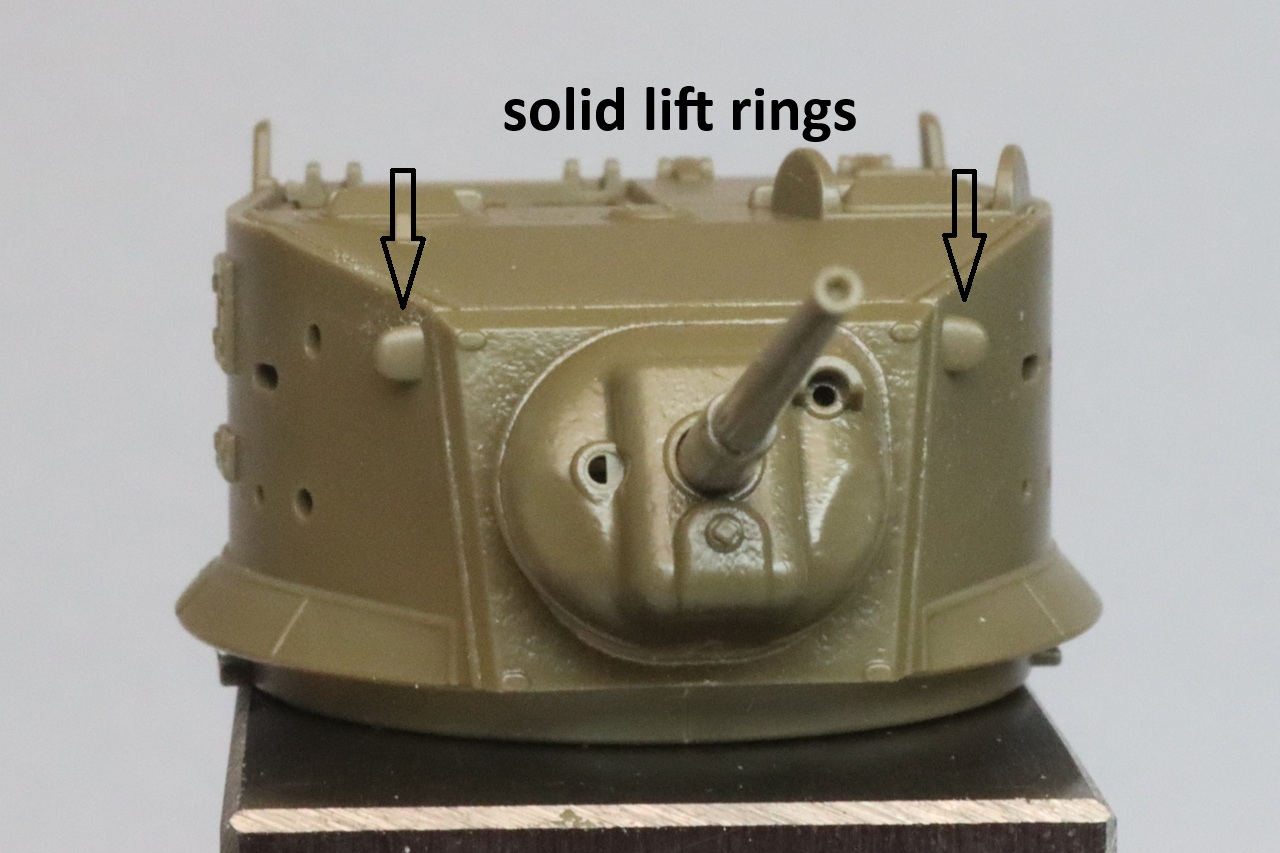 When installing the track grousers on the side of the turret, pay attention to the size and orientation of the mounting pins so that you get the parts right side up. On the front of the turret there is a little bit of play in the location of the grousers, so it is best to install adjacent parts at the same time so that they don’t interfere with each other. The tow cable is represented by a length of thread that glues into plastic shackles. The thread has a realistic texture and has no fuzz or fraying. The thread was slightly too large to glue neatly into the recesses on the plastic shackles. I found that if I saturated the ends with CA glue, I could shave down the ends so that they would fit.