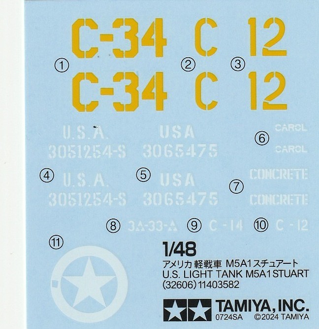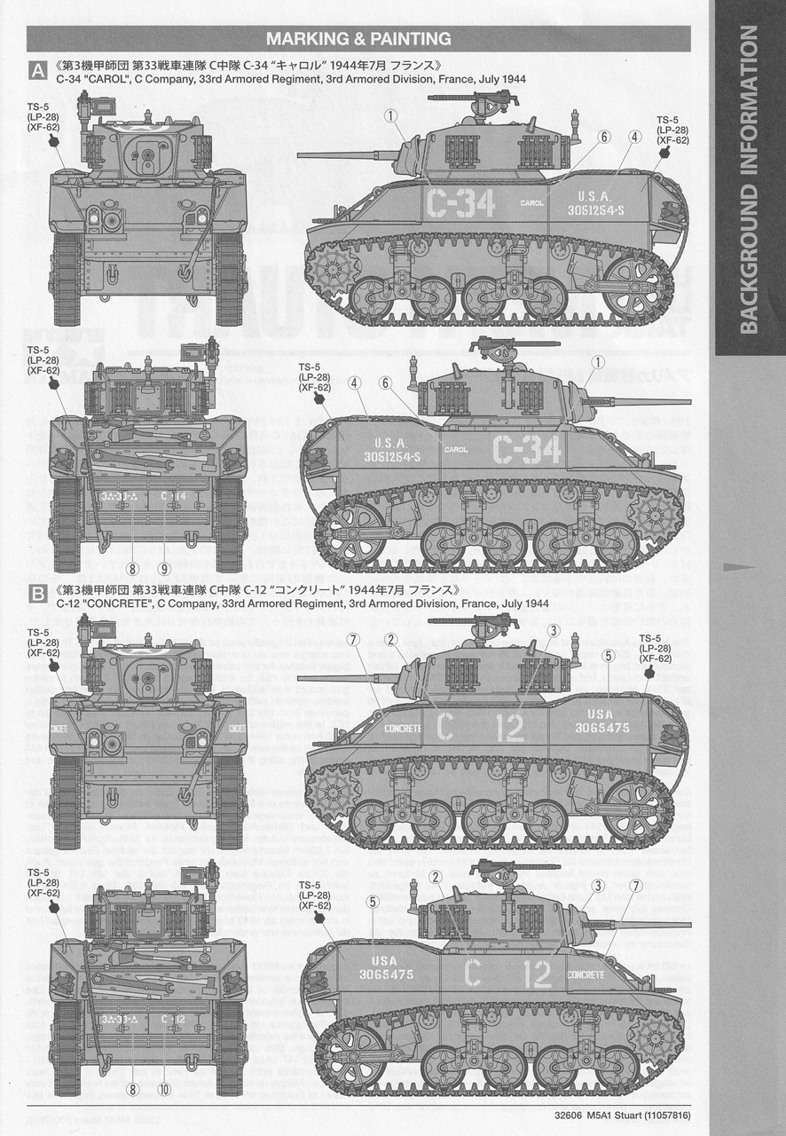 The instructions are clearly illustrated and easy to follow. Color call-outs are keyed to Tamiya paints. Two marking options are provided, both are vehicles of C company, 33rd armored regiment, 3rd armored division in France in 1944. If you happen to have a copy of David Doyle’s “Stuart Tank, Vol. 2“, photographs of these tanks are on pages 78 and 80. The decals are sharply printed and in good register.