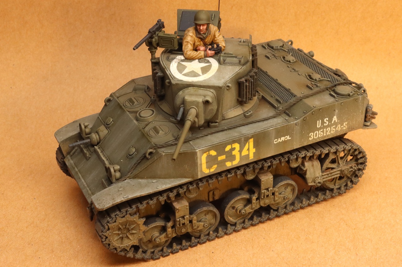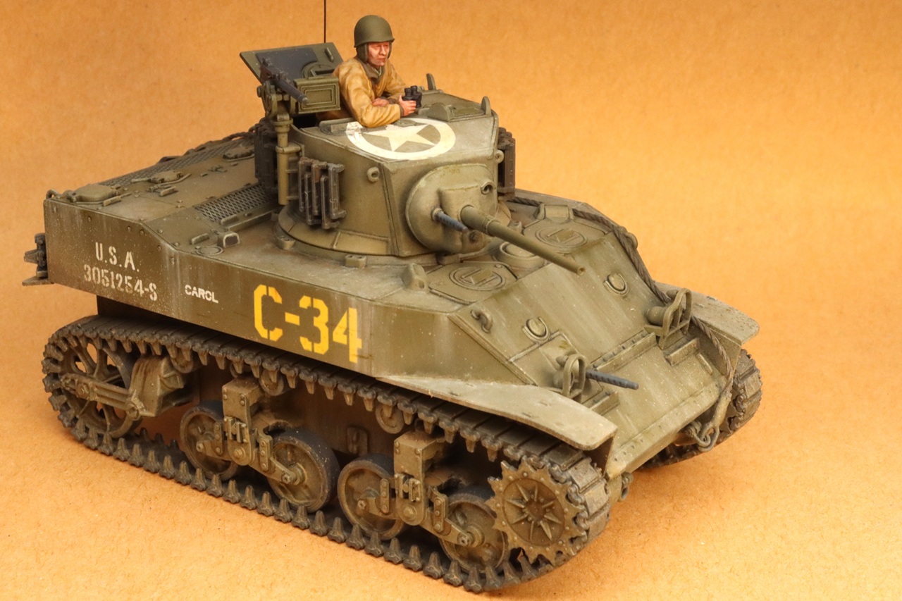 A legless tank commander figure is provided to go in the commander’s hatch. The figure is well sculpted and has a natural-looking pose. Although there is a lot of variety in how M5A1 Stuarts appeared, the kit doesn’t include any optional parts. Many photos of operational Stuarts show piles of stowage secured to the tanks, but no stowage parts ae provided. If you want stowage, sandbags, spoked wheels, sand skirts, or a machine gun shield you’ll need to source the parts elsewhere. I imagine that this lack of extra stuff is meant to keep the kit simple and below the cost of 1/35th scale kits. This is a very compact little model. If you are short on display space or are worried about complex dioramas getting too large or expensive, these Tamiya 1/48th kits are worth considering. This kit goes together simply and easily but still results in a good-looking model. This is a good entry-level kit for someone new to armor modelling, but it is not so simplified that a little extra effort won’t result in a satisfying build for someone used to more expensive and complex kits.
