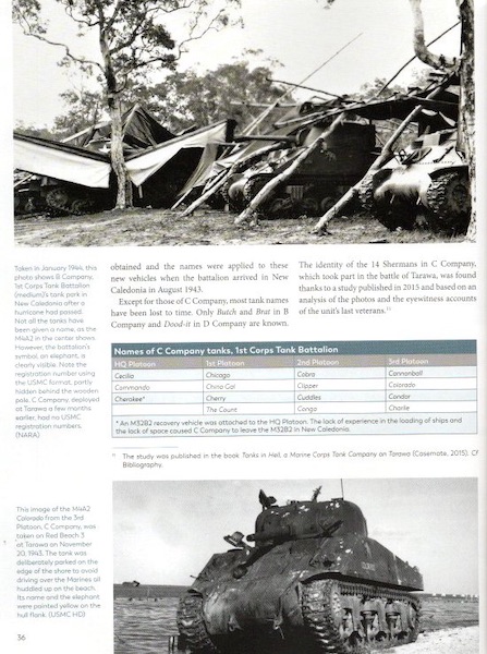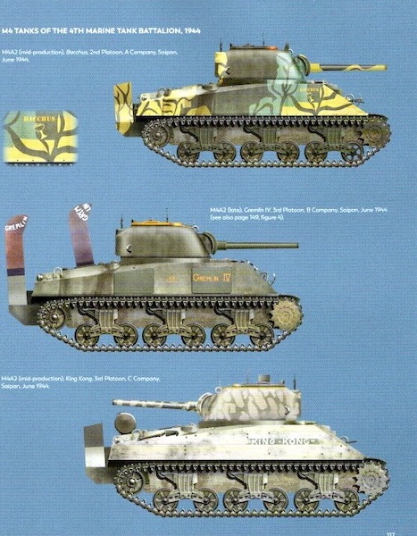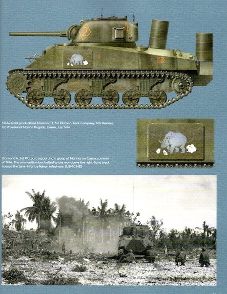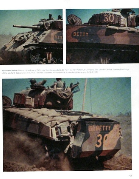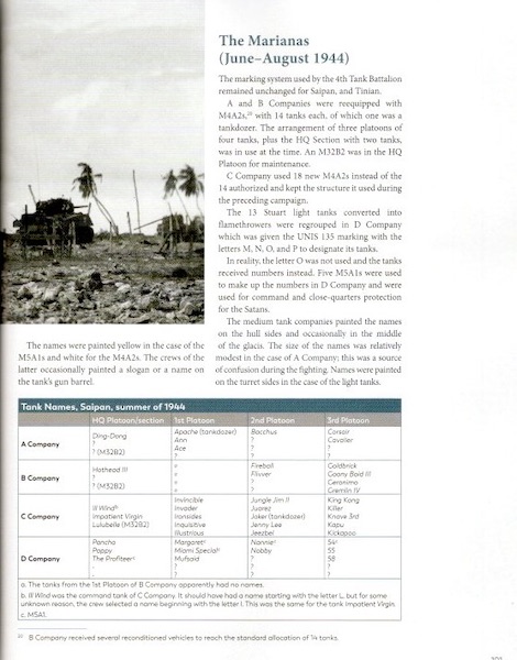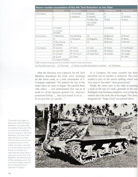 The markings on tanks of the United States Marine Corps during World War II are so varied that some have concluded they were meaningless, even anarchic. Official documents offer little insight, but a careful study of period photographs and film, cross-referenced with combat reports and veteran accounts, reveals the different systems of markings that combat units used to identify their vehicles. These markings varied between units, and from one campaign to the next, but were well-thought-out and designed to be practical and easy for tankers to interpret. In addition to tactical markings, most tankers were given names by their crews, and these were added to the tank’s markings. Personifying the tank often boosted crew morale and led to even more careful maintenance of the tank. Names were approved by tank commanders, and also followed systems that aided quick identification in combat.