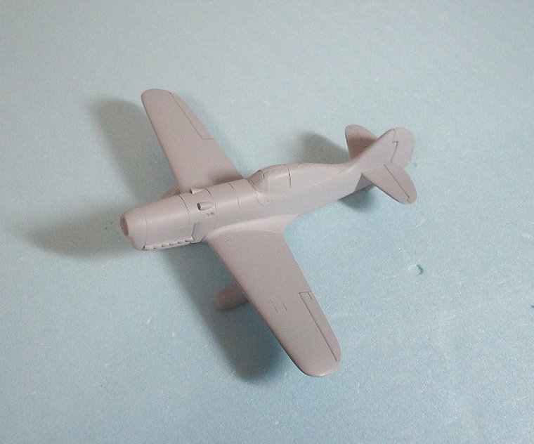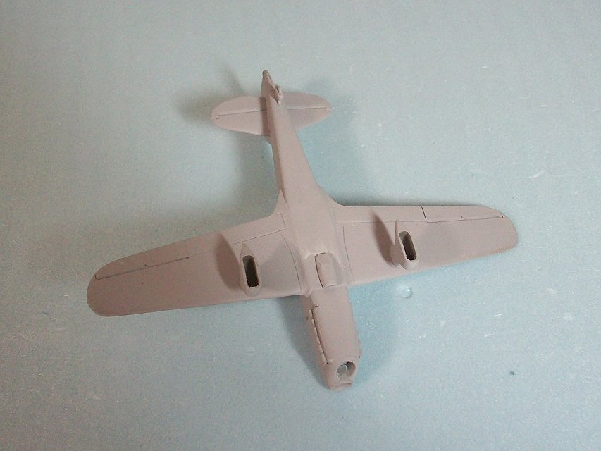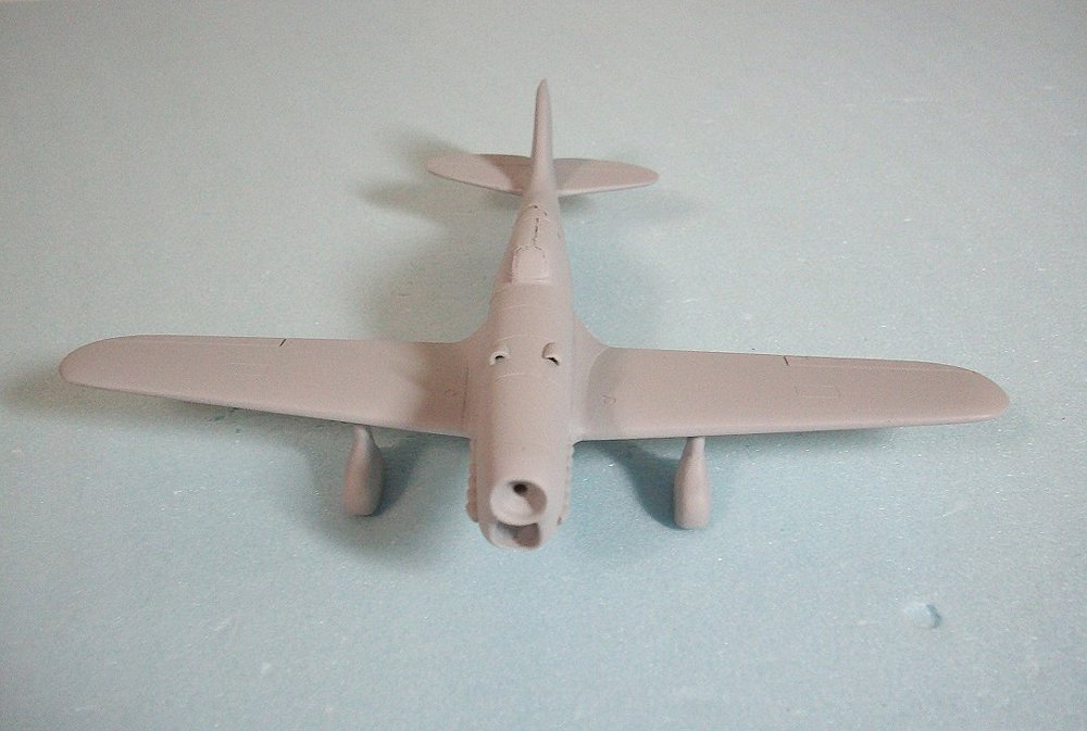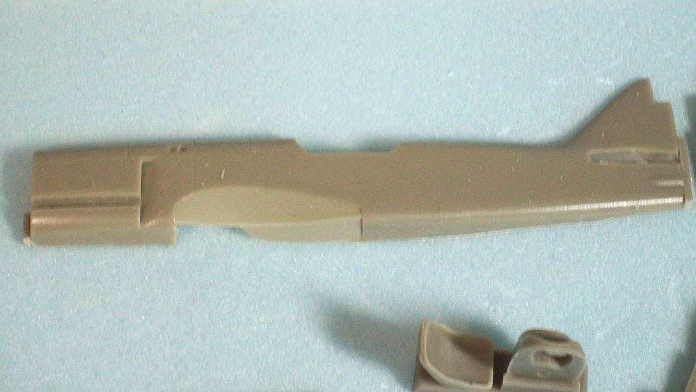 Once the cockpit parts were together and placed in the fuselage, it was time to join the two halves. No problems here as there was a very good fit. Next, I added the horizontal stabs, and here some filler was used to fill in the open gaps. I use 3M Acryl Blue on resin kits as, once the gap is filled, lacquer thinner on a Q-tip will remove the excess and leave a smooth flush area without losing any detail to sanding. Then I added the nose cap, which also required a small amount of filler. The next step was to join the one-piece wing to the fuselage. A small amount of filler was needed along the wing fillets and where the rear of the wing and the fuselage meet. The spatted gear needed a little sanding around the peg to get it to fit in the holes in the wing. Once again, a small amount of Acryl Blue was used to fill, and the excess removed with lacquer thinner.