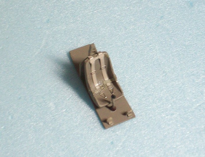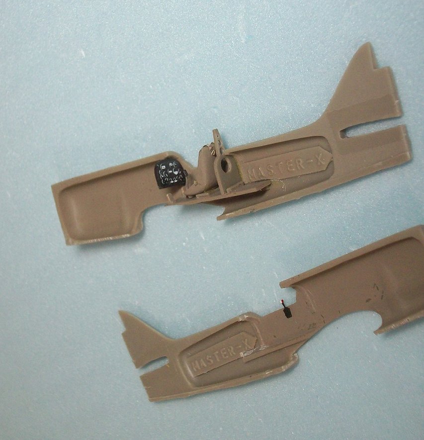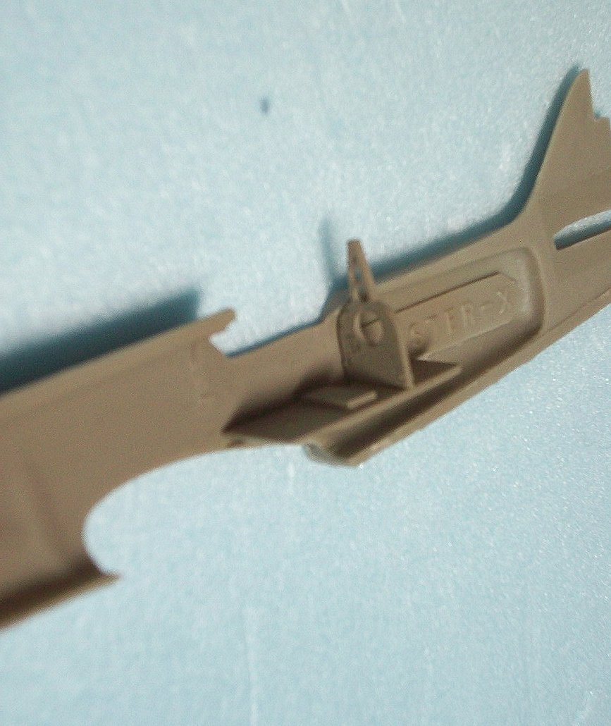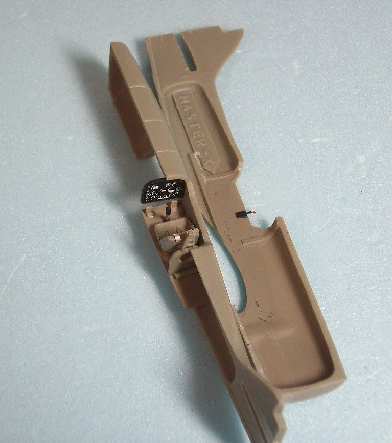 To fit the rear bulkhead/headrest I needed to take off between 1/8 and 3/16 of an inch from the part at the bottom, as well as sand a small indention into the back of the cockpit opening for the headrest to recess in. Also, to get the floor in, I removed some of the maker’s nameplate from where it is cast into the inside of the fuselage – up to the bottom of the letters and two to three letters in length within the name, and the fuselage halves closed easily. I also added some simple wedges to look like rudder pedals, a photo etch throttle assembly, and seatbelts from the spares box, as these items were not included in the kit.