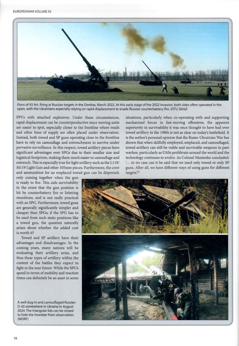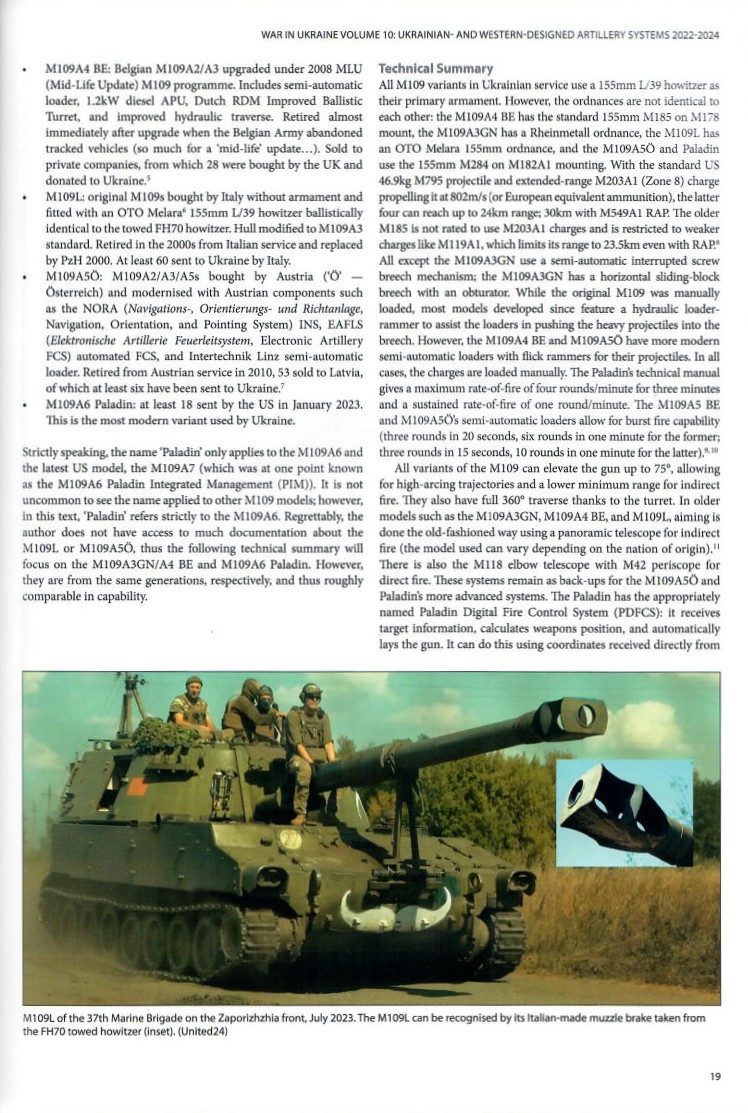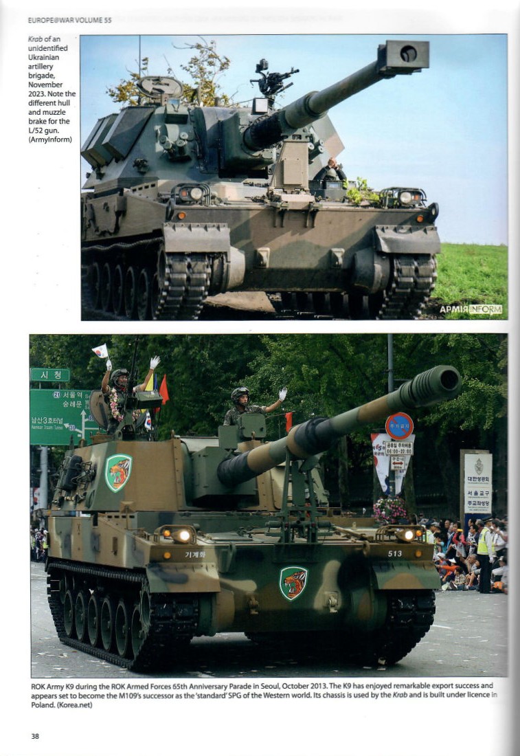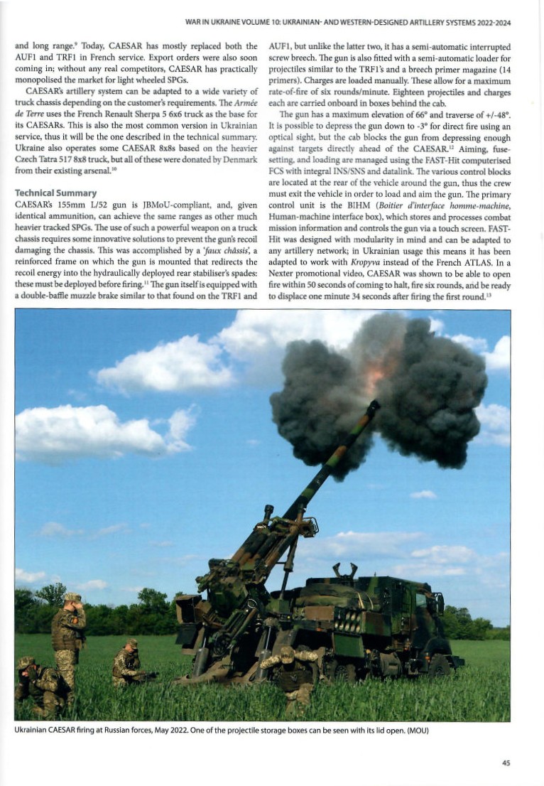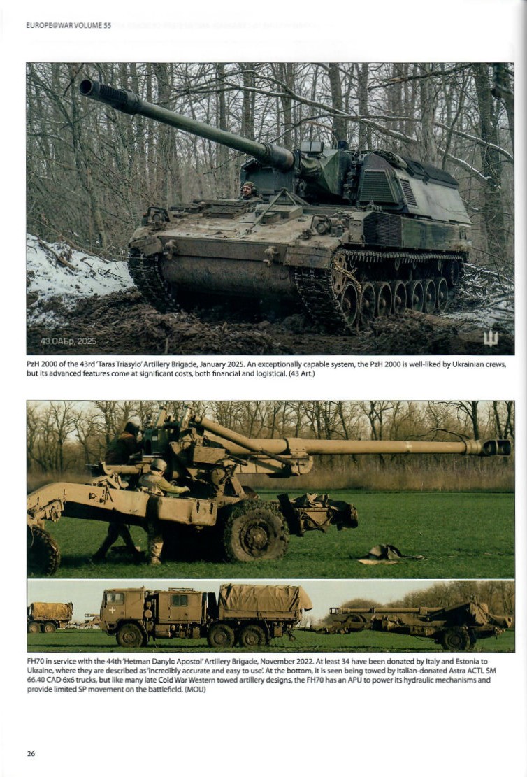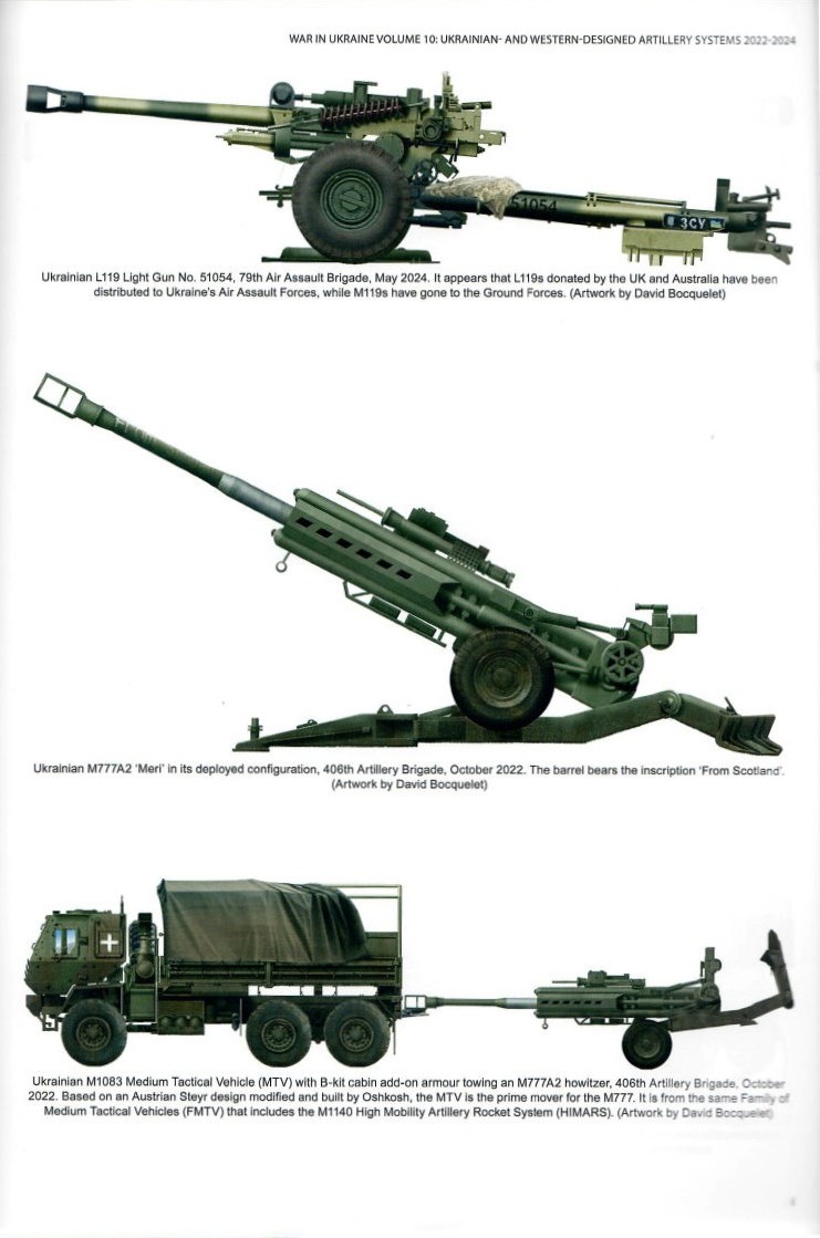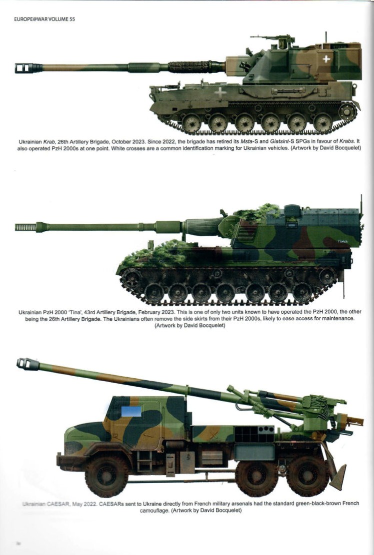 The M777 “Tripple Sevens”, or “Tri Sokiri” (‘Triple Axes’ – ‘7’ looks like an ax) as the Ukrainians refer to them, the M109 SPG (including M109A3GN, German M109Gs sold to Norway; М109А5Ö from Austria; and M109A6 Paladins from the US), German Panzerhaubitze 2000 SPG, British AS90 SPG, Polish Krab SPG (“Polonising” AS90 turrets with South Korean K9 chassis), French wheeled CAESAR (Camion Équipé d'un Système d'Artillerie, or "Truck equipped with an artillery system" in English), former Czechoslovakia DANA (both Czechia and Slovakia produce variants of this wheeled artillery system), and Swedish Archer wheeled SPG are covered in great detail, resplendent with detailed color photographs.