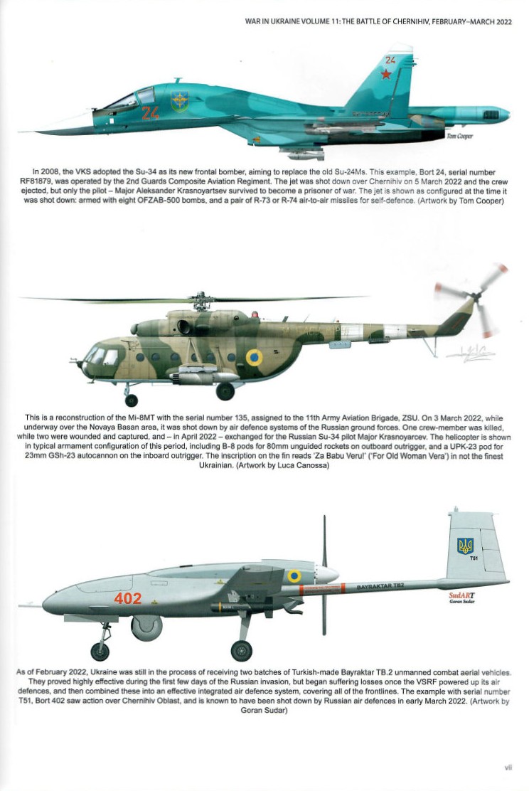 The photographs and profiles are well worth the price of the book, particularly for modelers who want to build a model, vignette or diorama of current Russian and/or Ukrainian combat vehicles and aircraft. The book is replete with both serviceable and destroyed vehicles. The battles took place during the winter of February – March 2022 and snow and non-snow, but cold, backgrounds, perfect for weathering inspiration. Ground combat vehicles include BMP-1, BMP-2, BTR-82A, T-72A and B, 9M317ME Buk-M3 (medium-range air defence system), ATMZ-5-4320 fuel truck, MT-LB, 2K22 Tunguska (self-propelled anti-aircraft defense system), T-64BV, 2S1 Gvozdika 122mm SPG, and 2S3 Akatsiya 152mm SPG. Aircraft are represented by the Su-34, Mi-8MT Hip, Turkish Bayraktar TB-2 UAV, Tu-22 Backfire, Yak-18, MiG-15, MiG-21, and L-39 Albatross.