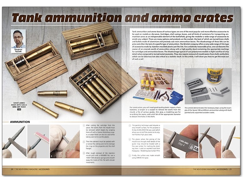 By far the longest article is written by Sergiusz Pęczek covering 11 pages. The author uses another Miniart kit, “Soviet Ammo Boxes with Shells kit # 35261, to give us an in-depth look at his techniques for finishing shells and ammo crates. As before Ammo by Mig products are used mostly; however, Allclad II Metal paints were used for the shells. What I found most interesting was the amount of coverage the author presents in getting the ammunition ready for painting. He describes in extensive detail his techniques using scrapers and various grits of sandpaper. Amazing photographic detail is incorporated giving the reader an up-close view. Not left out, the ammo wooden crates are given the same amount of coverage explaining in detail with clear images his techniques.
