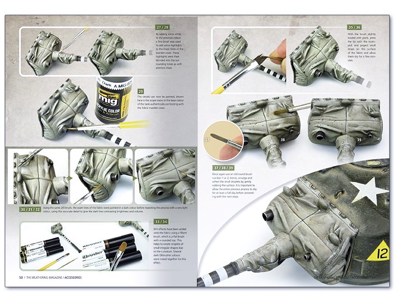 “The latest issue of your favorite magazine concentrates on an important aspect of any build: accessories. The details and optional accessories that bring realism into your modelling projects, add narrative, or complete a diorama. These accessories present interesting painting and weathering opportunities. For example, few WWII German projects are complete without “German Jerry Cans”, stowage and sandbags are a popular subject with armour modeler’s, tank ammunition and ammo crates including the different metallic areas and textured woods. Mig Jimenez, explains the processes behind painting and weathering a large fabric gun mantlet: adding interest and texture to the material. Each technique and effect explained in this latest issue can be applied to a range of subjects: whether a beginner or experienced modeler this issue will leave you inspired for your next project”
